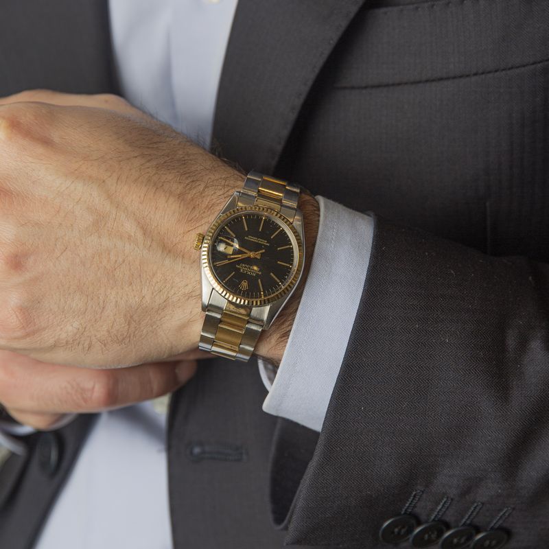 cassa in acciaio, fondello serrato a vite, ghiera zigrinata in oro giallo, corona marcata, quadrante nero, grafica oro, indici oro applicati con trizio, datario a ore tre con lente cyclope, movimento a carica automatica cal 3035 n. 0020515, bracciale oyster in acciaio e oro ref. 78363 finali 458 J, chiusura a scatoletta in acciaio marcata Rolex, vetro plastica, gr. complessivi 105. Diam. mm 36