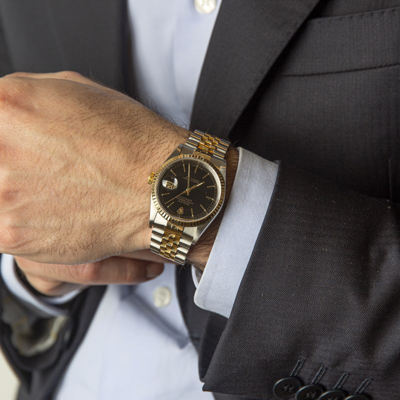 cassa in acciaio, fondello serrato a vite, corona marcata, ghiera zigrinata in oro giallo, quadrante nero, grafica oro, indici applicati al trizio, datario a ore tre con lente cyclope, movimento a carica automatica cal 3135 n. 7603558, bracciale jubilee in acciaio e oro ref. 62523H finali 455B, cod. produzione V2, lungh. interna cm 19, chiusura a scatoletta in acciaio marcata Rolex, vetro minerale. Diam. mm 36. Corredato di scatola.