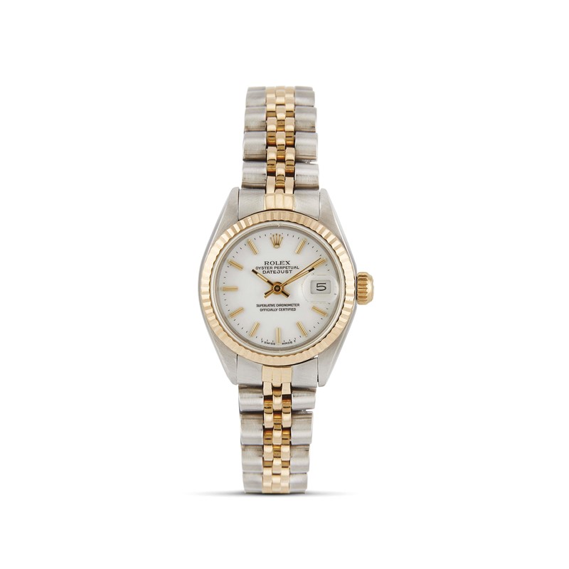 cassa in acciaio, fondello serrato a vite, ghiera zigrinata in oro giallo 18kt, corona marcata, quadrante bianco in porcellana, grafica nera, indici applicati di color oro al trizio, datario a ore tre con lente cyclope, movimento a carica automatica cal 2135 n. 1798189, bracciale jubilee in acciaio e oro ref. 62523D.18 finali 468B, cod. produzione H9, lungh. interna cm 18, chiusura a scatoletta in acciaio marcata Rolex, vetro minerale, gr. 53. Diam. mm 26