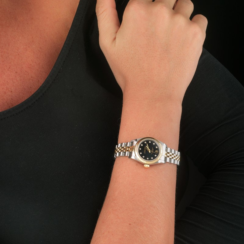 cassa in acciaio, fondello serrato a vite, corona marcata, ghiera zigrinata in oro giallo, quadrante nero non originale, grafica oro, indici con pietre incolori, movimento a carica automatica cal 2230 n. 0721965, bracciale jubilee in acciaio e oro ref 62523D-18 finali 491B, cod. produzione D17, lungh. interna cm 17, chiusura a scatoletta in acciaio marcata Rolex, vetro minerale, gr. 51. Diam. mm 26