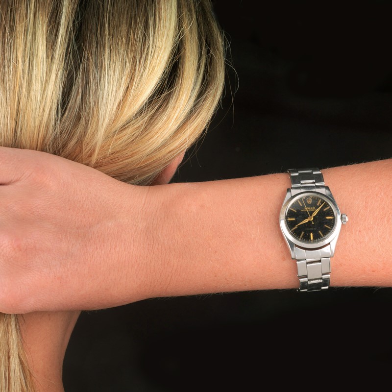 cassa in acciaio, fondello serrato a vite, corona marcata, lunetta liscia in acciaio, quadrante nero, grafica oro, indici applicati di color oro, movimento a carica manuale cal 1210 n. N 16905, bracciale oyster a maglie ripiegate in acciaio finali 51, lungh. interna cm 19, chiusura a scatoletta marcata Rolex, vetro plastica. Diam. mm 30