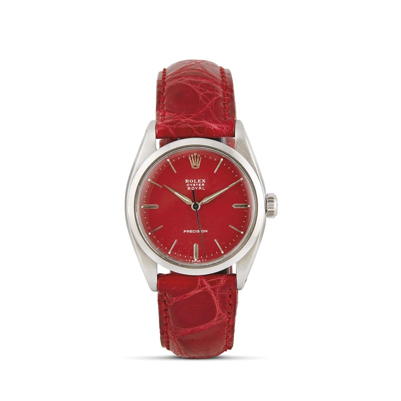 cassa in acciaio, fondello a vite, corona marcata, lunetta in acciaio, quadrante rosso ristampato, grafica bianca, indici applicati con trizio, movimento a carica automatica cal 1210 n. 49991, cinturino in pelle rossa, fibbia in acciaio marcata Rolex, vetro plastica bombato. Diam. mm 35