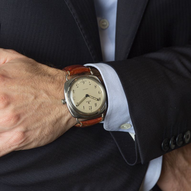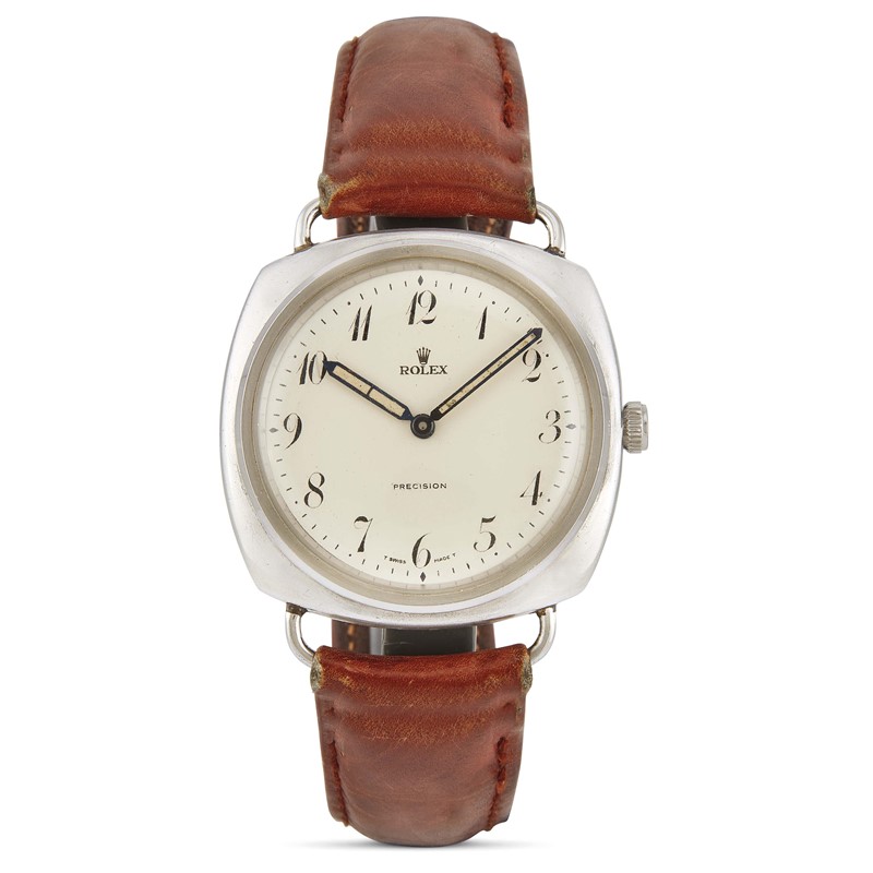 ROLEX REF. 3646 N. 10099XX cassa di forma in acciaio, fondello serrato a vite recante incisione Oyster Watch Co, lunetta a scalino, quadrante bianco ristampato, numeri arabi stampati, movimento a carica manuale, cinturino in pelle marrone, fibbia in metallo, vetro plastica. Dim. mm 45x45