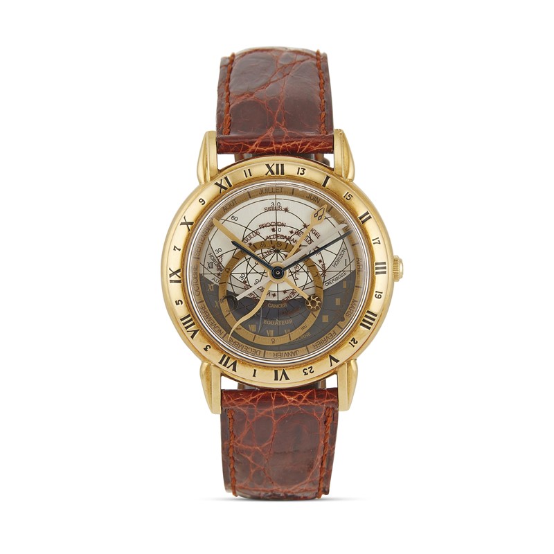 cassa in oro giallo 18kt, fondello serrato con viti, ghiera in oro giallo con suddivisione in 12 ore in numeri romani con indicazione dell'ora legale vigente e una suddivisione in 24 ore in numeri arabi con indicazione dell'ora locale effettiva, quadrante recante planisfero con indicazione delle parti visibili e invisibili della volta celeste, dell'equatore, dei tropici, lancetta lunare, lancetta solare, delle ore e dei minuti, lancetta del drago indicante le eclissi di sole e di luna, movimento a carica automatica, cinturino in pelle marrone, fibbia in oro giallo 18kt marcata Ulysse Nardin, vetro plastica, gr. complessivi 73. Diam. mm 39. Corredato di scatola in legno con rotore, garanzia e libretto.