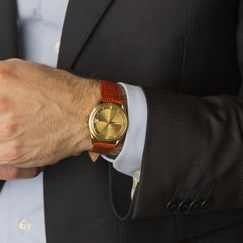 cassa in oro giallo 18kt, fondello serrato a vite, corona marcata, quadrante di colore oro, grafica nera, indici incisi, datario a ore tre, movimento a carica automatica cal 218-2 n. 329805, cinturino non originale in pelle marrone, fibbia in metallo dorato, vetro plastica, gr. 50. Diam. mm 33