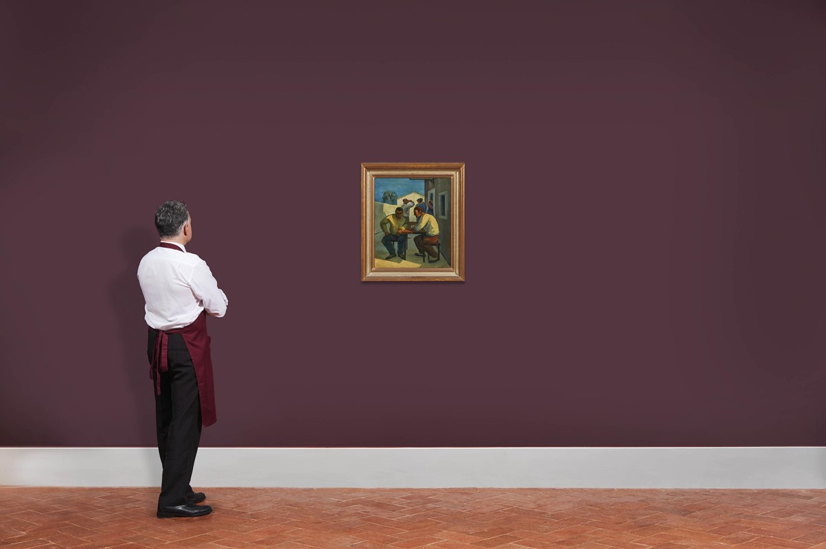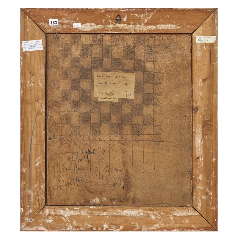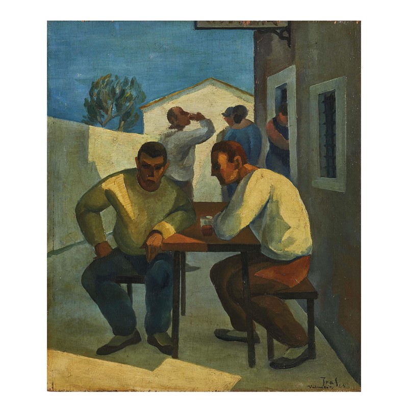 ROBERTO IRAS BALDESSARI (Innsbruck 1894 - Roma 1965) Les Buveurs 1926 olio su tavola cm 59,5x50 in basso a destra iscritto Iras 1926 / Valencia al retro cartigli