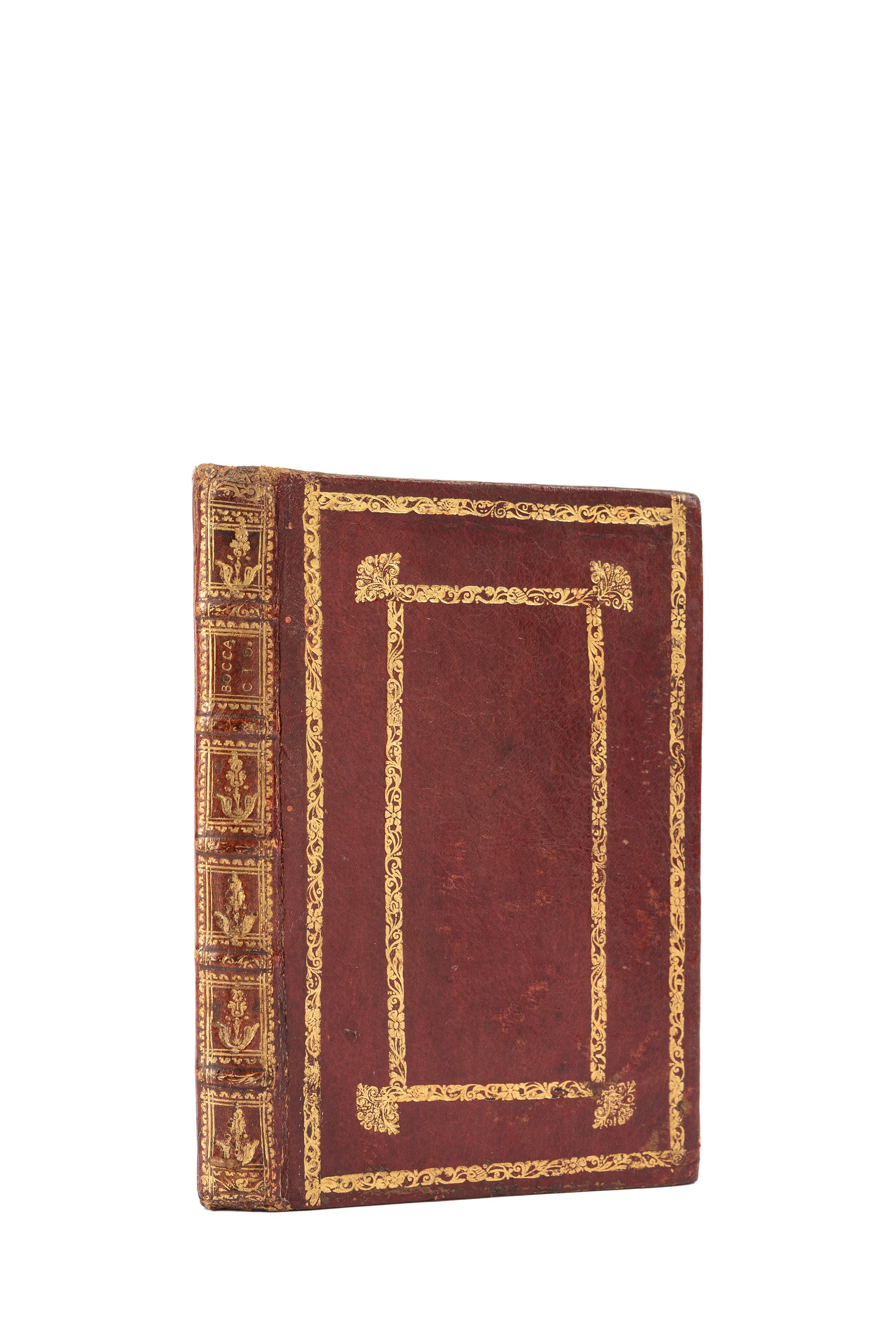 1521 Firenze, per gli heredi di Philippo de Giunta, 1521 ad́ XX febraio. In 8°. In fine volume marca del Giglio fiorentino con due putti, che reggono ai lati due cornucopie, poggiata su un basamento, timbro nobiliare evanescente alla prima carta. Splendida legatura in pelle rossa con cornici di ferri dorate ai piatti, dorso a 5 nervi con scomparti decorati da elementi floreali e titolo, tagli dorati, sec.XVIII.