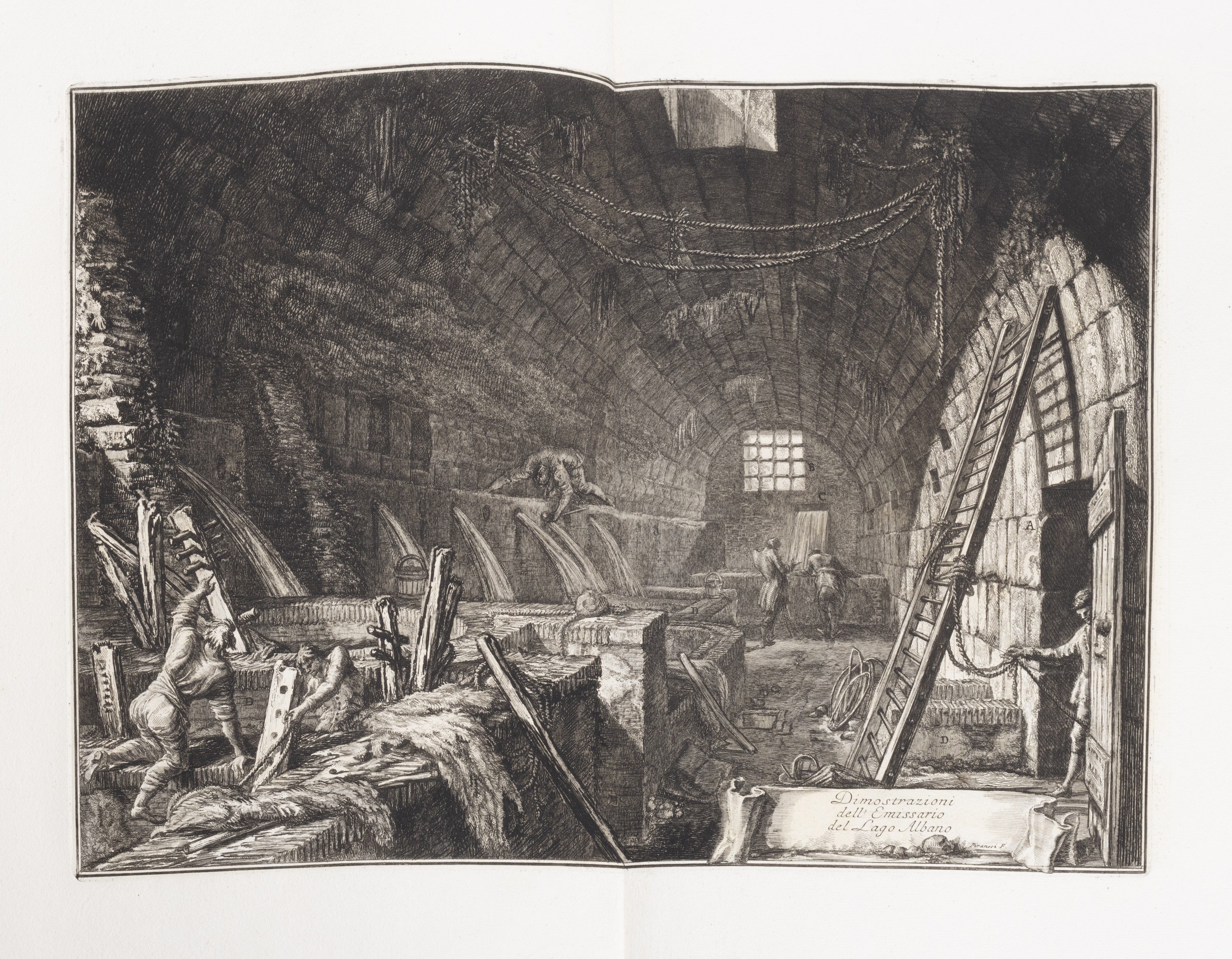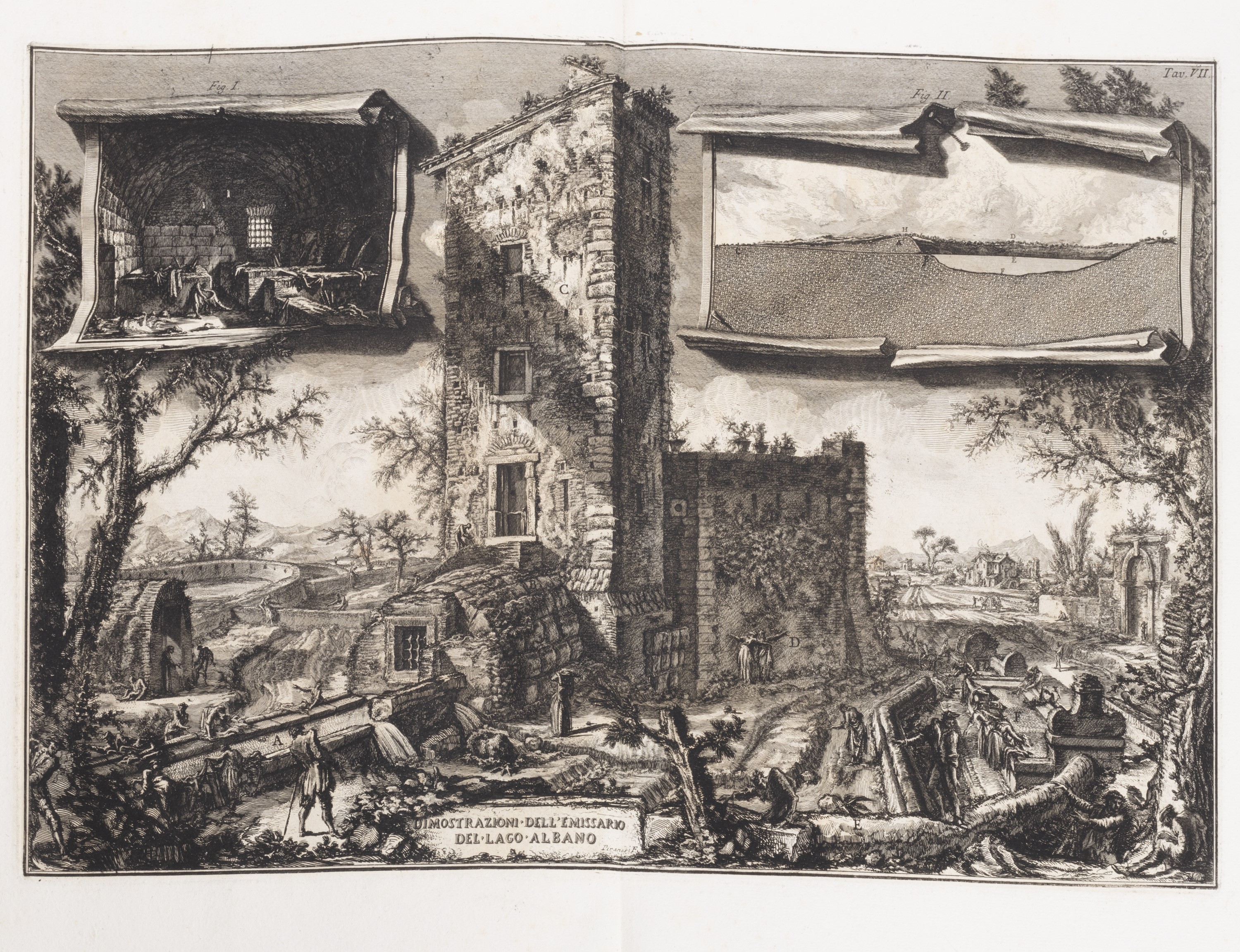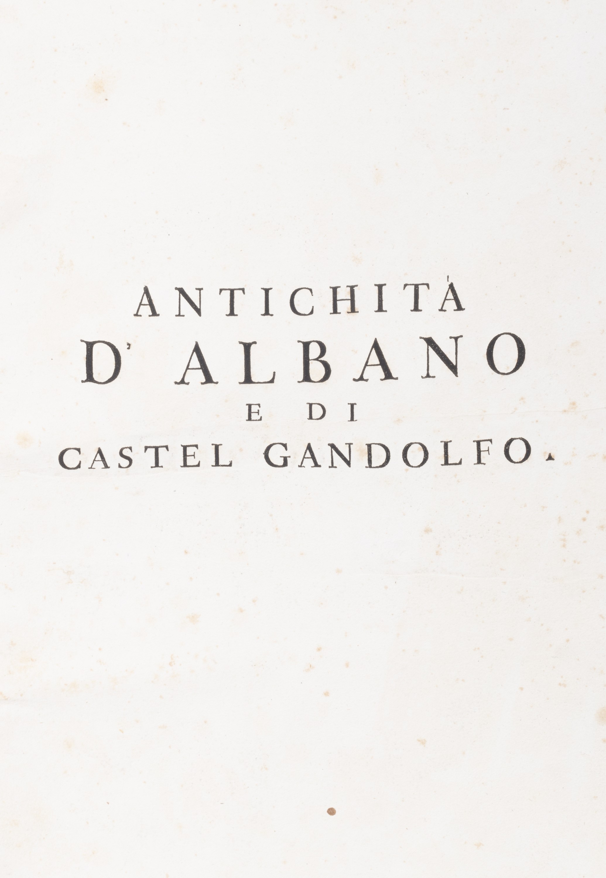 1700 Roma []. Occhietto, frontespizio inciso, tavola dedicatoria a doppia pagina a Papa Clemente XIII, con 27 montate su brachette a piena e doppia pagina numerate I-XXVI e 1 tavola in fine non numerata. Legato con Descrizione e disegno dell'Emissario del Lago Albano. [Roma: 1762-64]. Frontespizio inciso, 9 tavole. Legato con Di due spelonche ornate dagli antichi alla riva del Lago Albano. [Roma: 1762-64]. Con 12 tavole, di cui 4 in formato più piccolo (mm. 194 x 285 all'impronta della lastra). Prima opera con frontespizio rifilato al margine superiore, tav. V con piccolo foro al margine superiore bianco e margine interno lievemente macchiato, tav. XVI con due piccoli frammenti sullo specchio dell'incisione, esemplare con fioriture ed arrossature leggere, legatura coeva in mezza pergamena con angoli, tassello al dorso con Volume Unico impresso in oro, restauri con scotch al dorso, angoli in pergamena mancanti al piatto posteriore, qualche abrasione.