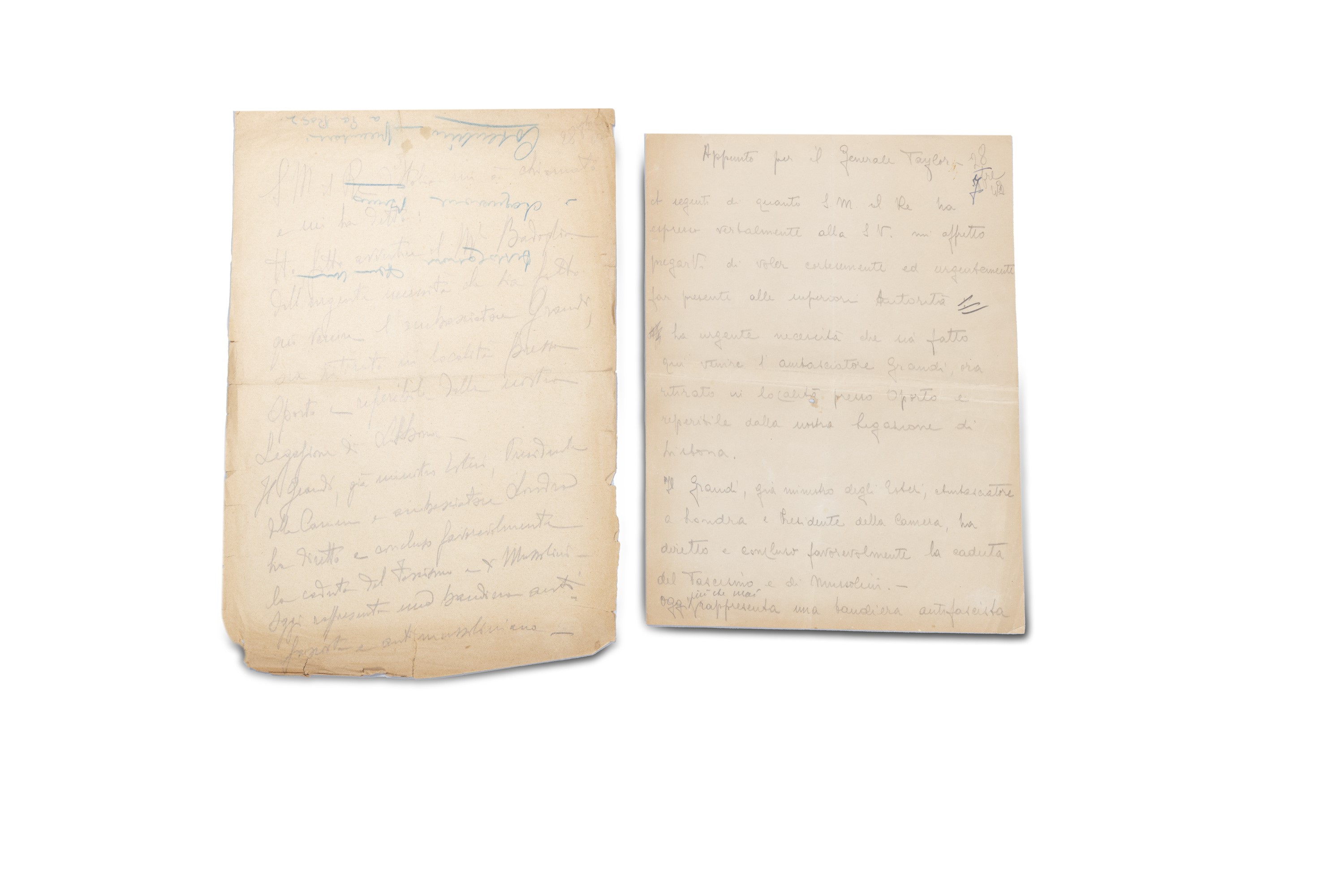 1943 Un foglio di carta 310 x 220 mm., tre facciate circa, con strappi al margine scritto a matita da Pietro Acquarone, ministro della Real Casa, per conto del Re e indirizzato al generale americano Maxwell Taylor; allegata trascrizione del foglio, sempre a matita, coeva.