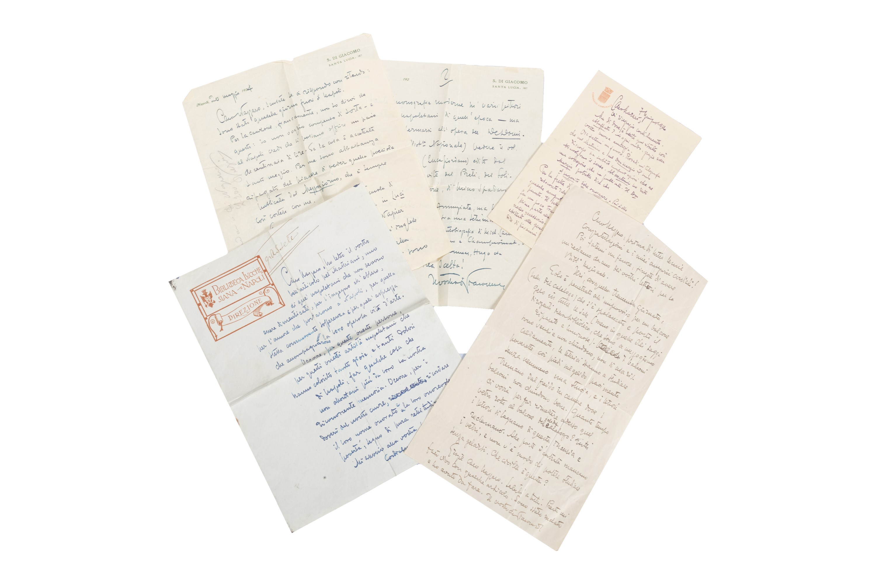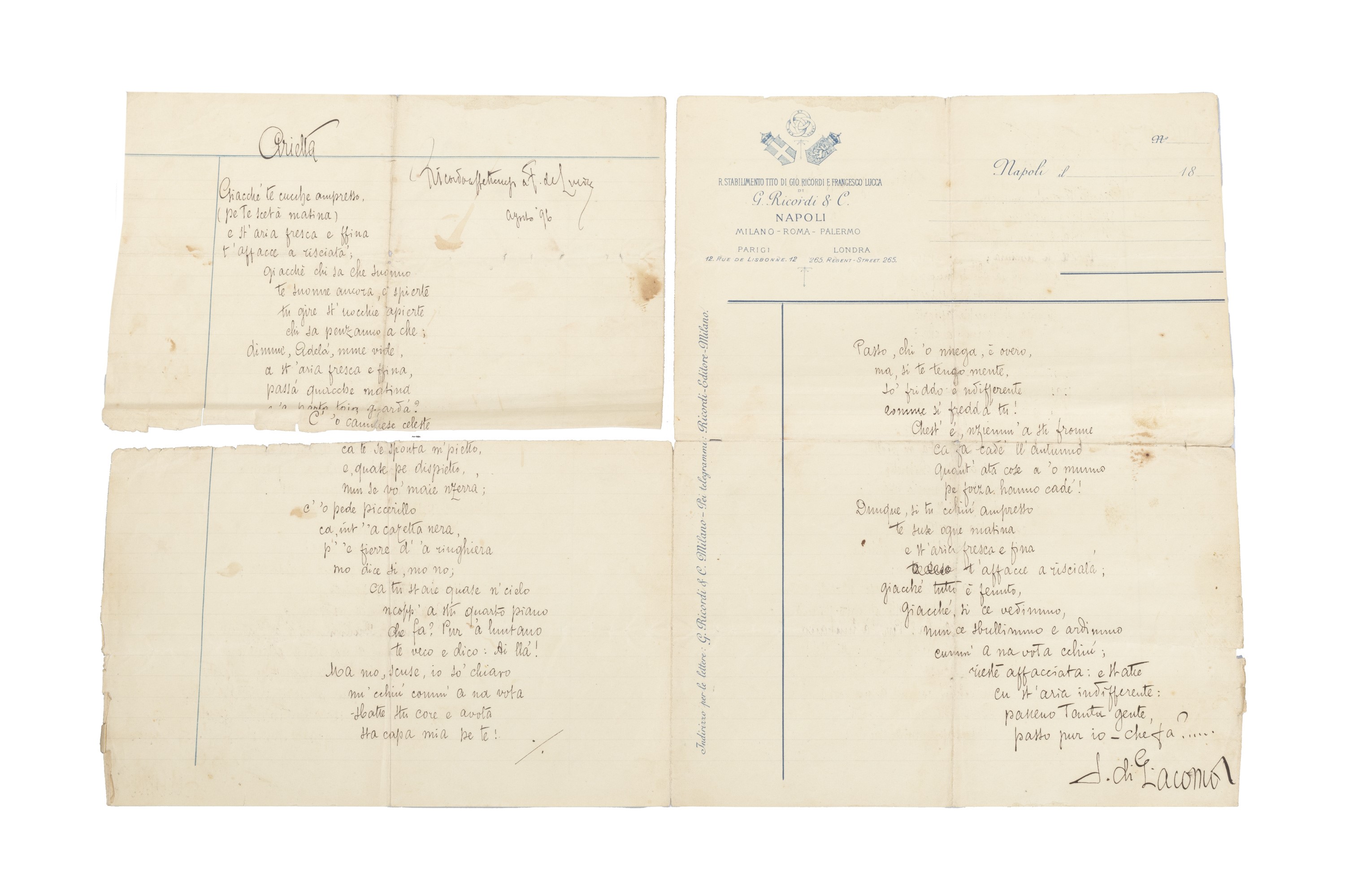 1896 Lungo componimento poetico autografo e firmato su due pagine, 280 x 215 mm. su carta intestata Ricordi, dal titolo Arietta, con dedica di pugno di Di Giacomo datata agosto 1896, una pagina strappata ma senza perdite; insieme 4 lettere di Di Giacomo a Carlo Nazzaro, su diverse carte intestate, databili 1916-'24, per un totale di 6 pp.; unito un brano originale di Assunta Spina, 11 pagine di una sorta di quadernetto autografo di Di Giacomo, in inchiostro violetto.