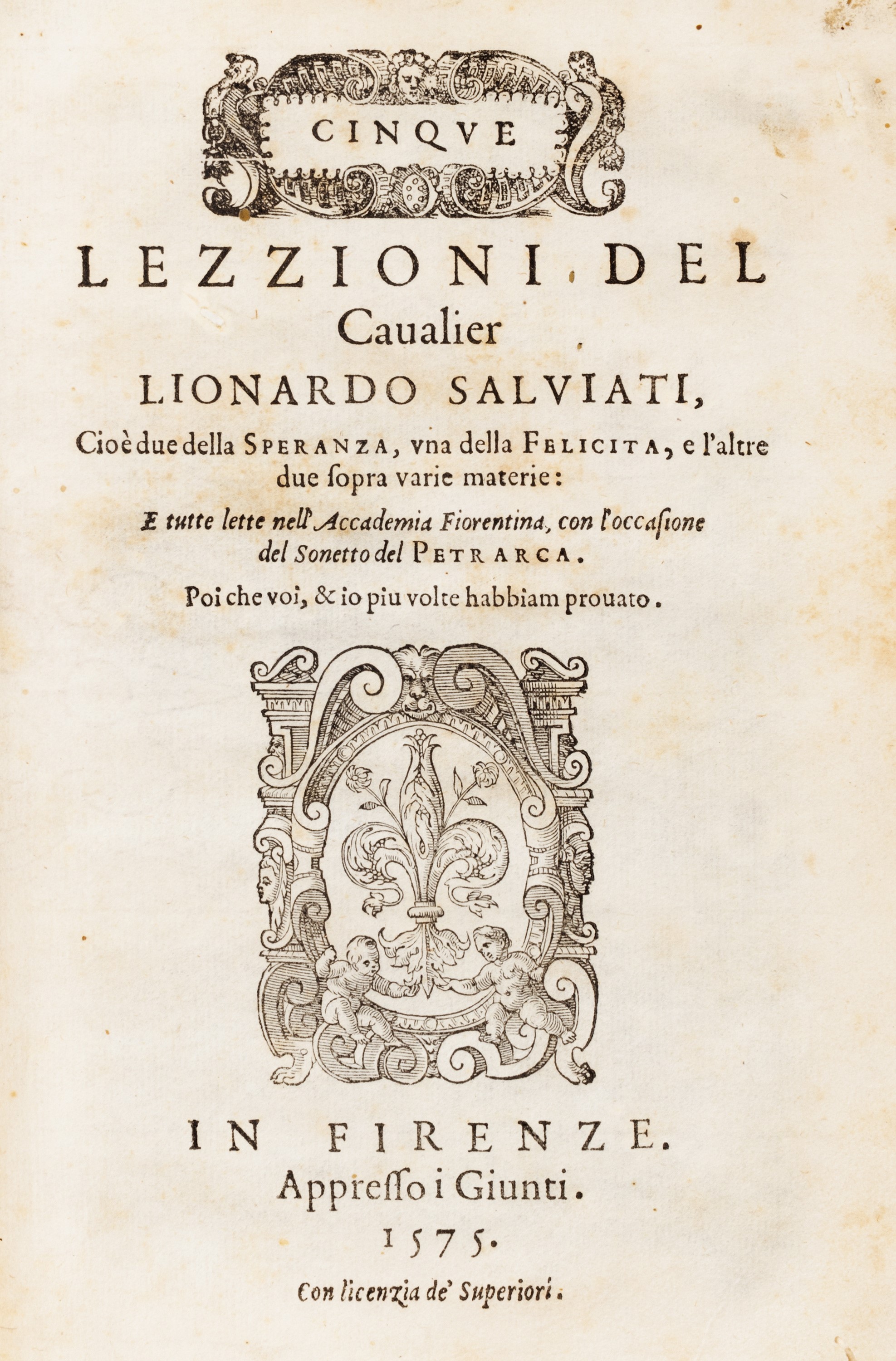 1575 Firenze: appresso i Giunti, 1575. In-4°.Marca editoriale al frontespizio, iniziali incise in legno figurate, piccoli fori di tarlo che non ledono lo specchio di scrittura, qualche arrossatura e macchie, legatura legatura in pelle del sec. XIX, al dorso tassello in pelle rossa con autore e titolo impressi in oro, lievi difetti.