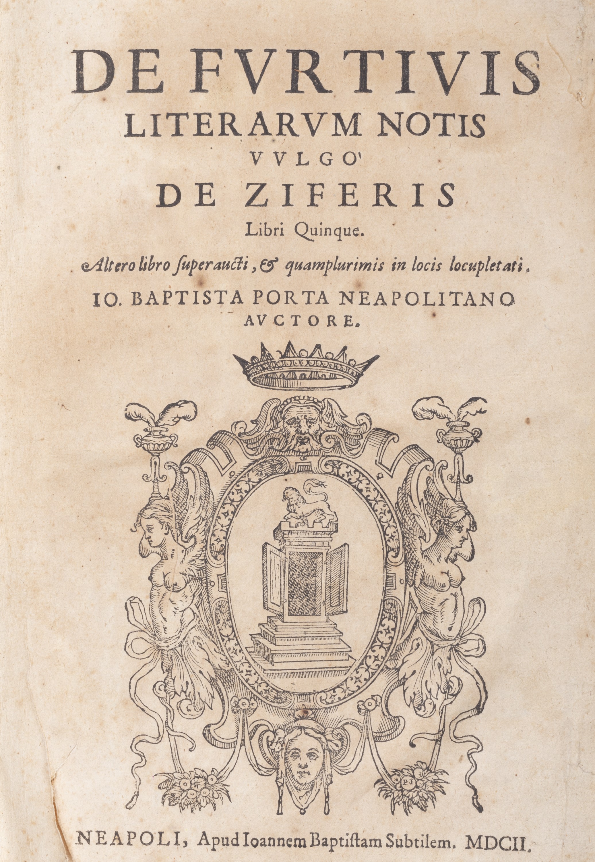 1602 Napoli Sottile 1602. In folio piccolo. Stemma inciso in legno dell'Autore al frontespizio, numerose xilografie con diagrammi e codici, capilettera, testatine e fregi incisi in legno, piccolo strappo senza perdita al margine inferiore del frontespizio e piccolo restauro al margine superiore, leggera brunitura, più intensa su poche carte, lavoro di tarlo al margine esterno degli ultimi fascicoli, legatura in pergamena coeva, titolo e autore in oro al dorso, qualche annotazione manoscritta, lievi difetti.