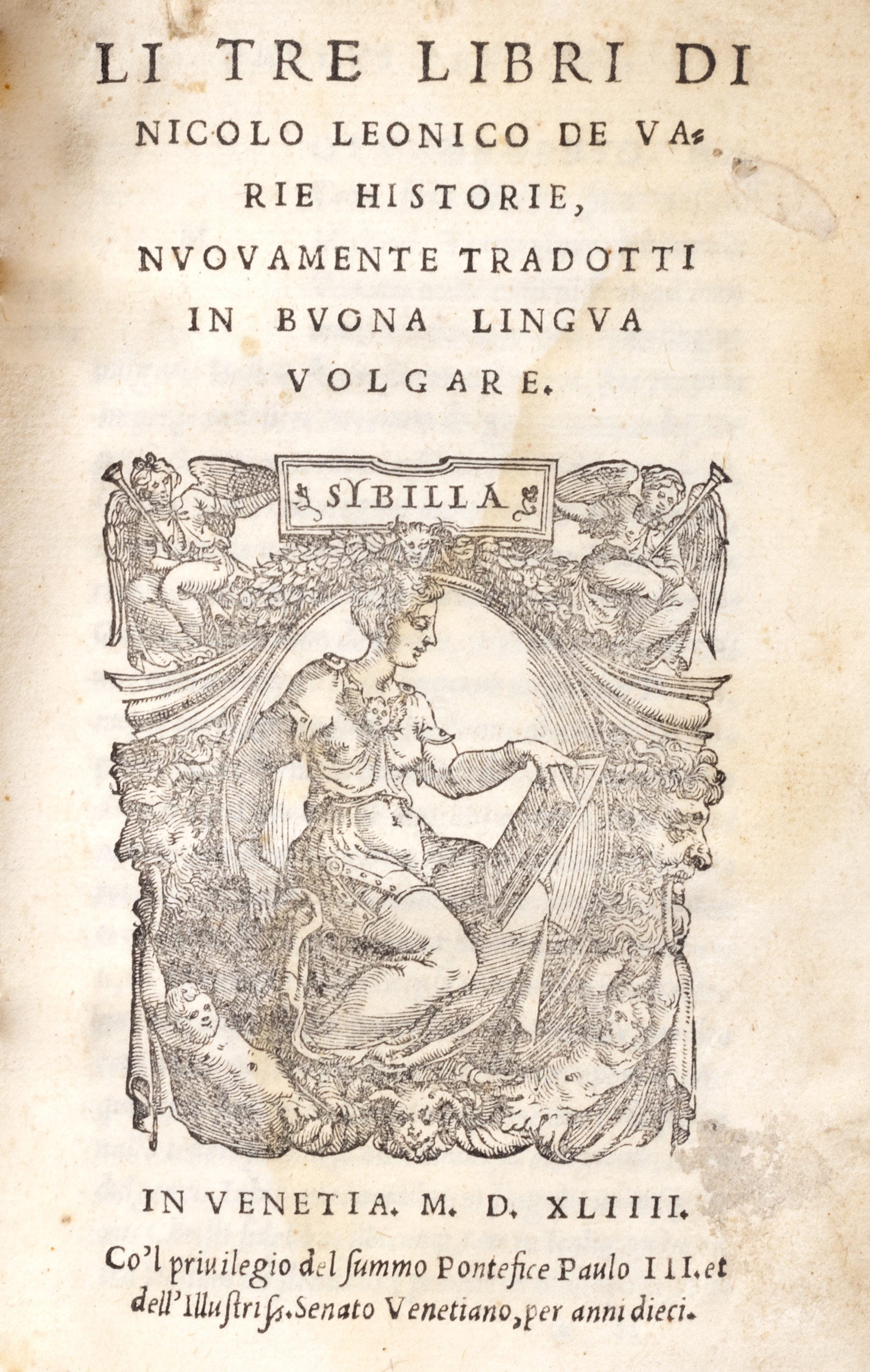 1544 Venezia, [Michele Tramezzino], 1544. In 12°. Vignetta xilografica al frontespizio e in fine, 3 piccoli fori di tarlo al frontespizio di cui uno restaurato, 1 foro di tarlo alla seconda carta, rare fioriture, alone di umidità al margine superiore, legatura coeva in pergamena, autore manoscritto al dorso, alcune macchie, difetti.