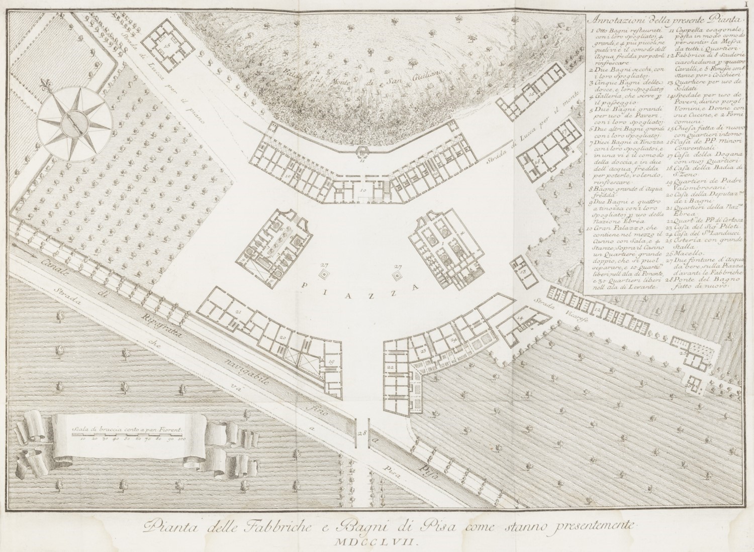 1750 Firenze, nella Stamperia Imperiale, 1750. In 2°. Titolo dell'occhietto Bagni di Pisa, frontespizio stampato in rosso e nero, due medaglie raffiguranti il dedicatario, Cesare Francesco, e la città di Pisa sul frontespizio, vignetta e iniziale calcografica a c. A1r, con 7 carte di tavole disegnate da Michele Piazzini e Giuseppe Ruggieri e incise da Niccolò Mogalli, qualche fascicolo leggermente allentato, rare e lievi fioriture marginali, legatura coeva in cartonato, autore e titolo manoscritti al dorso, lievi difetti.