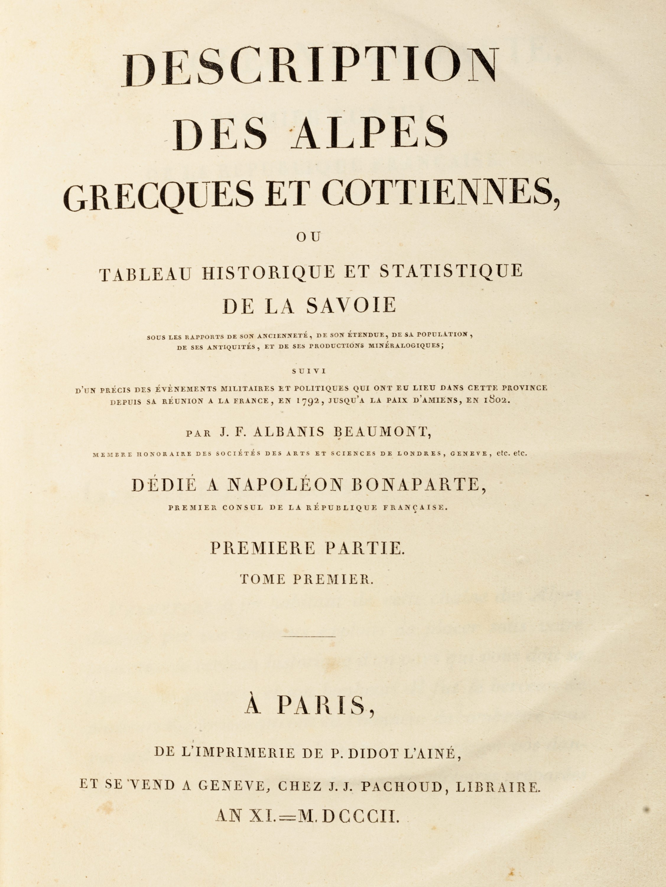 Parigi, Didot, 1802. 2 tomi in 4°. prima parte del tomo primo e prima parte del tomo secondo. In fine al primo tomo 24 tavole incise in rame, una non numerata, le altre numerate 1- 23, 5 di esse presentano strappi al margine, e la n.22 ha il margine laterale macchiato, il secondo tomo non presenta tavole, legature coeve in vitello nocciola ai dorsi lisci ovale in pelle rosa con titoli e fregi impressi in oro, qualche spellatura e graffi.