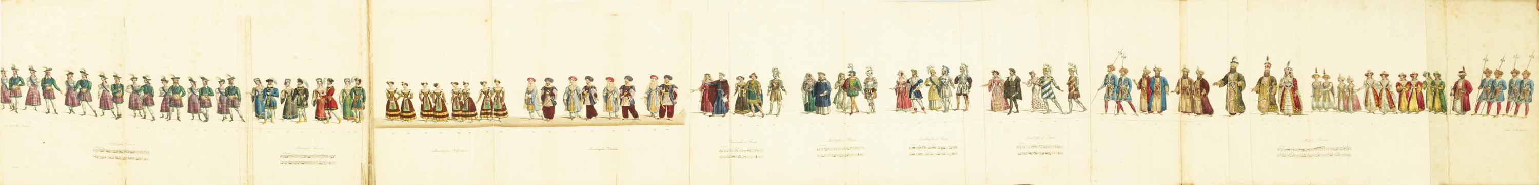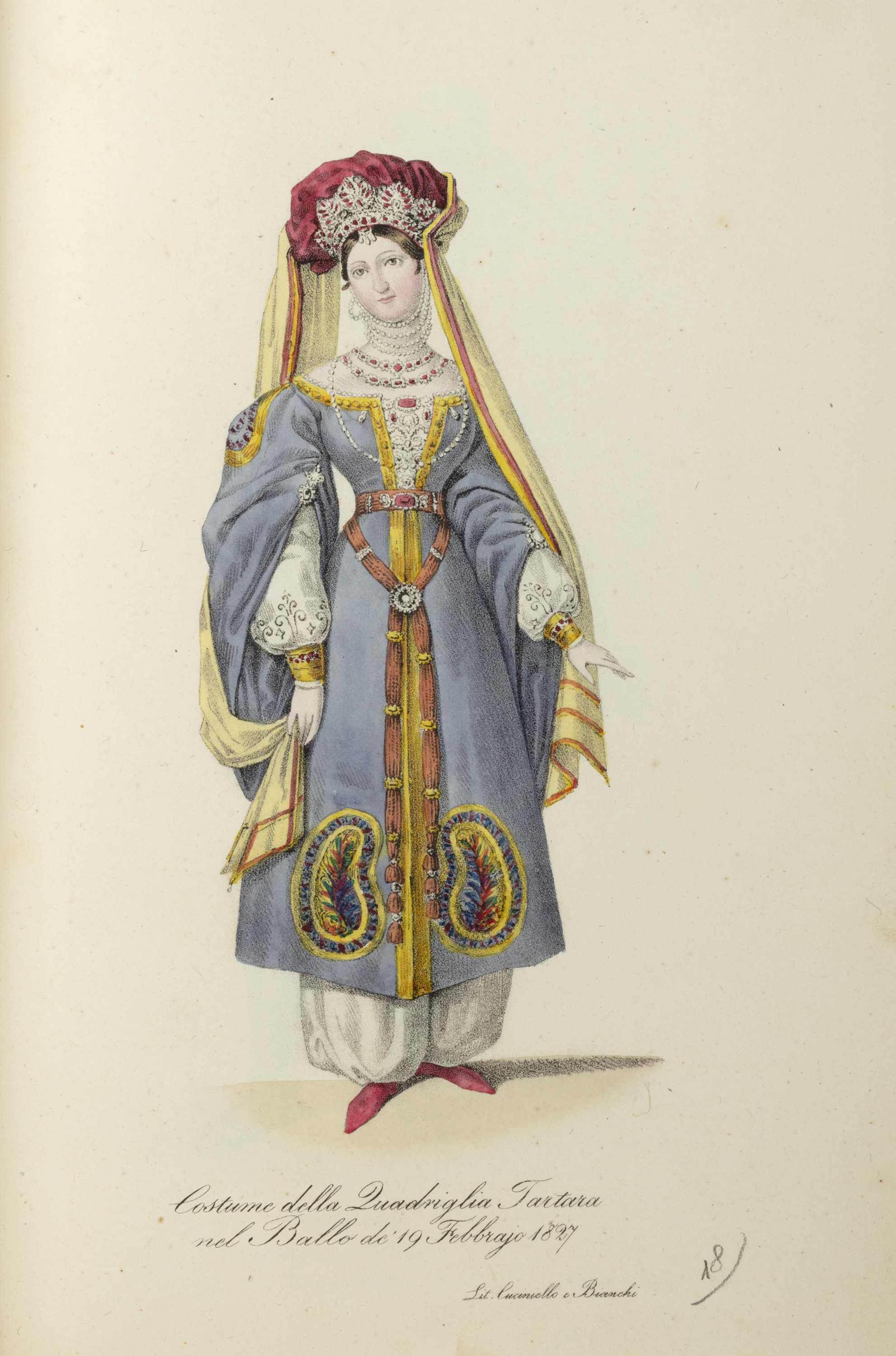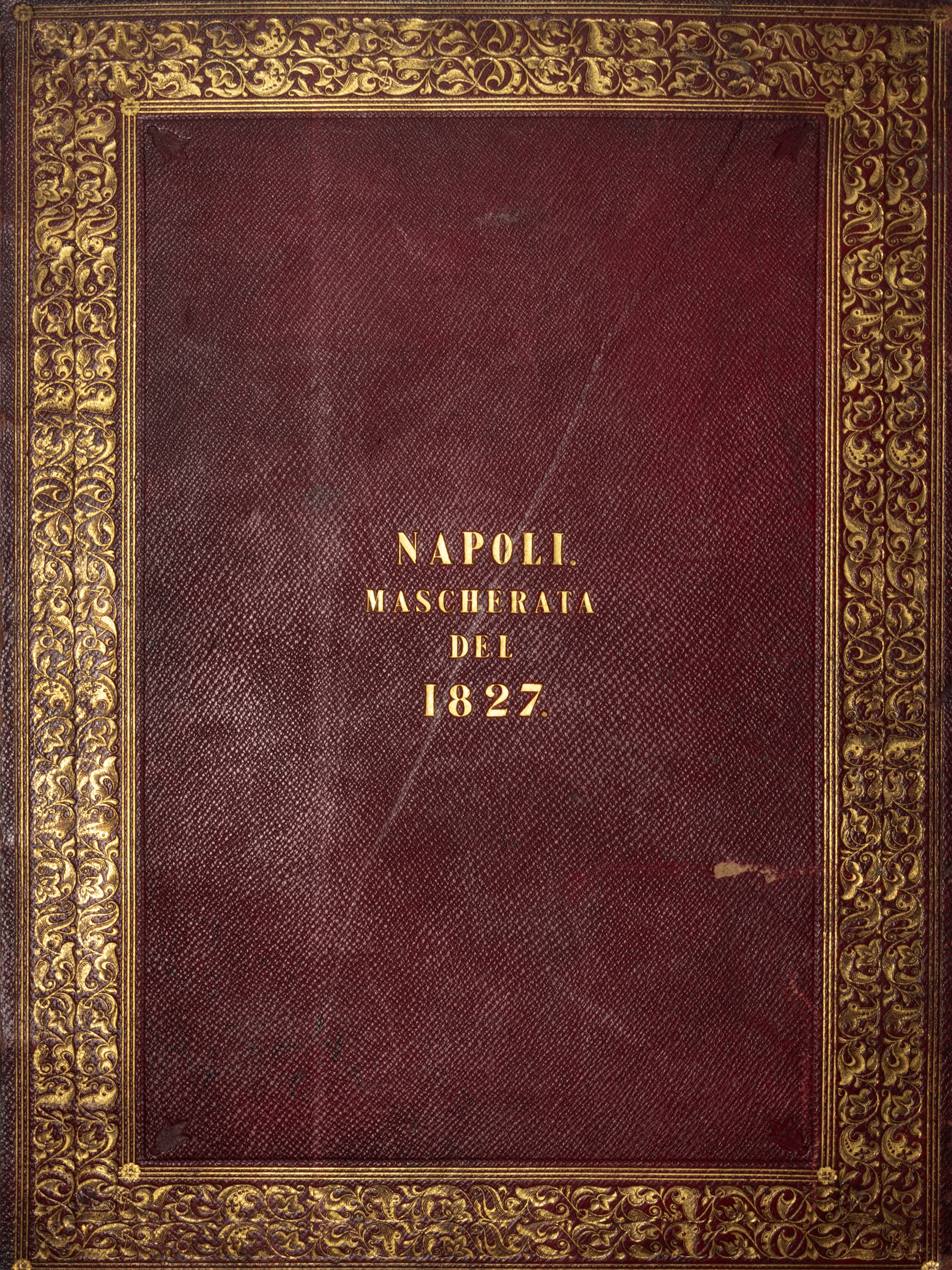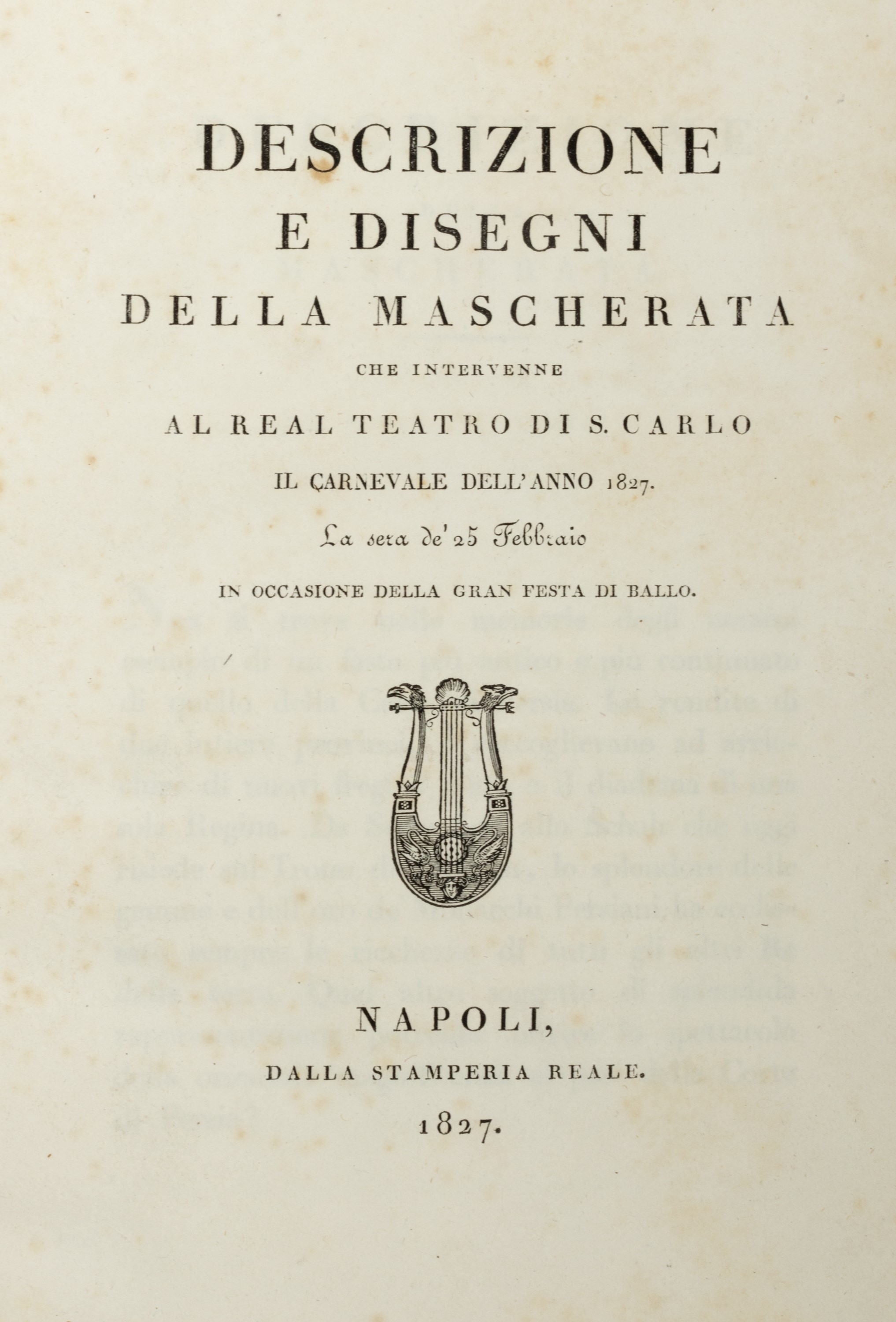 Napoli, Stamperia Reale, 1827. Folio p.20 con 39 tavole, litografate e colorate all'acquarello della bottega di Cuciniello e Bianchi, compresa la grande tavola della processione di tutte le quadriglie e della Corte di Persia lunga circa due metri, legatura coeva mz. pelle, titolo e fregi in oro al dorso.