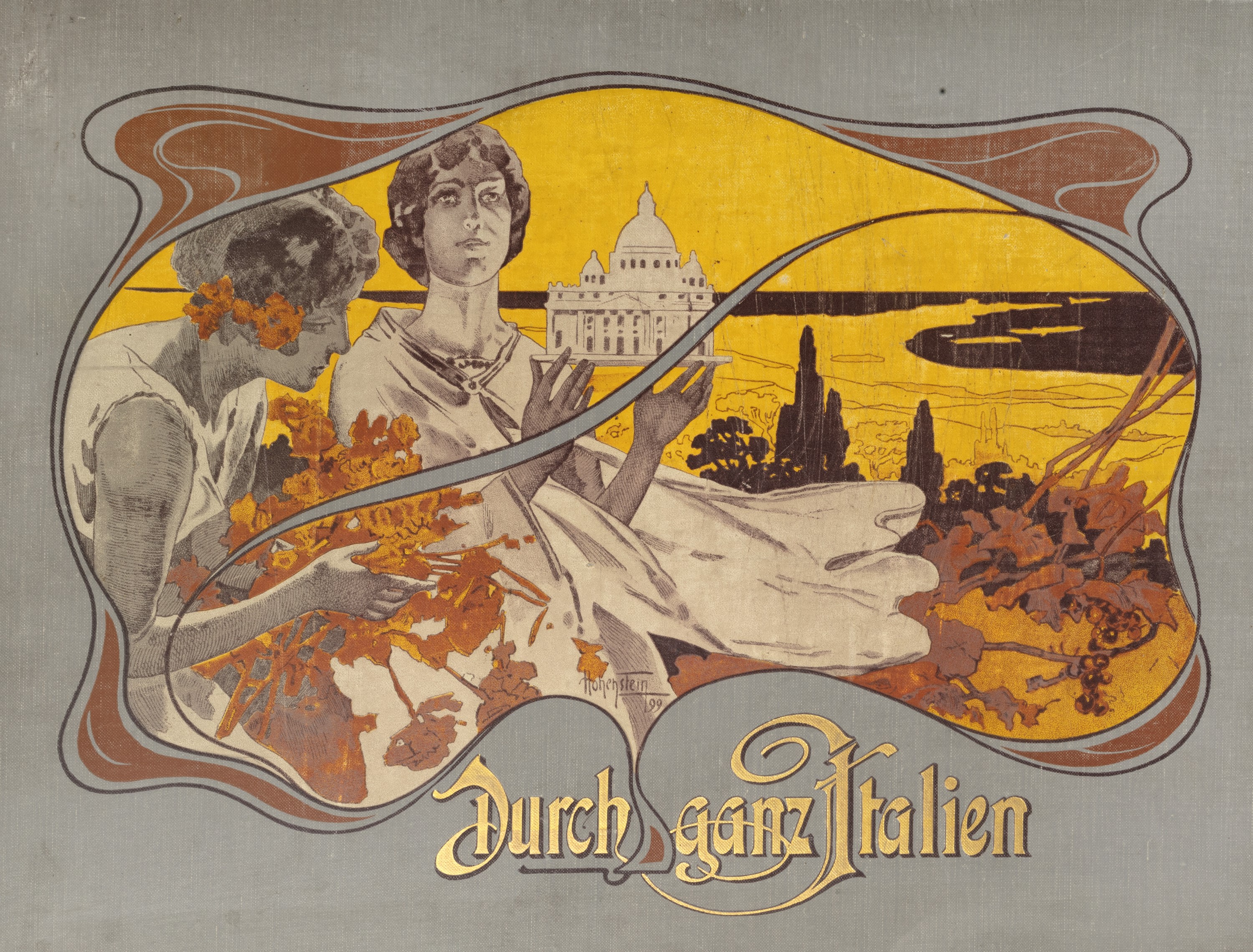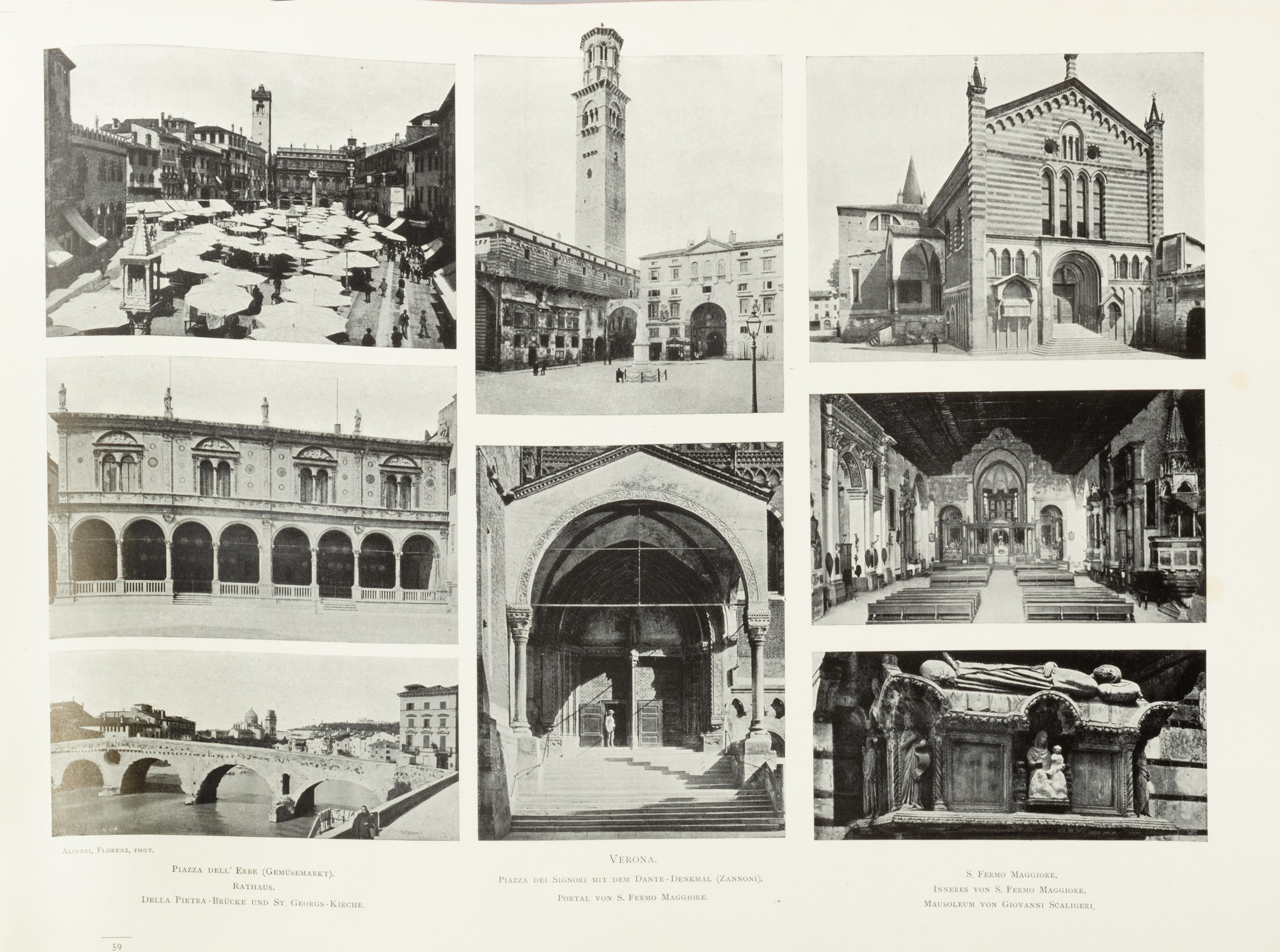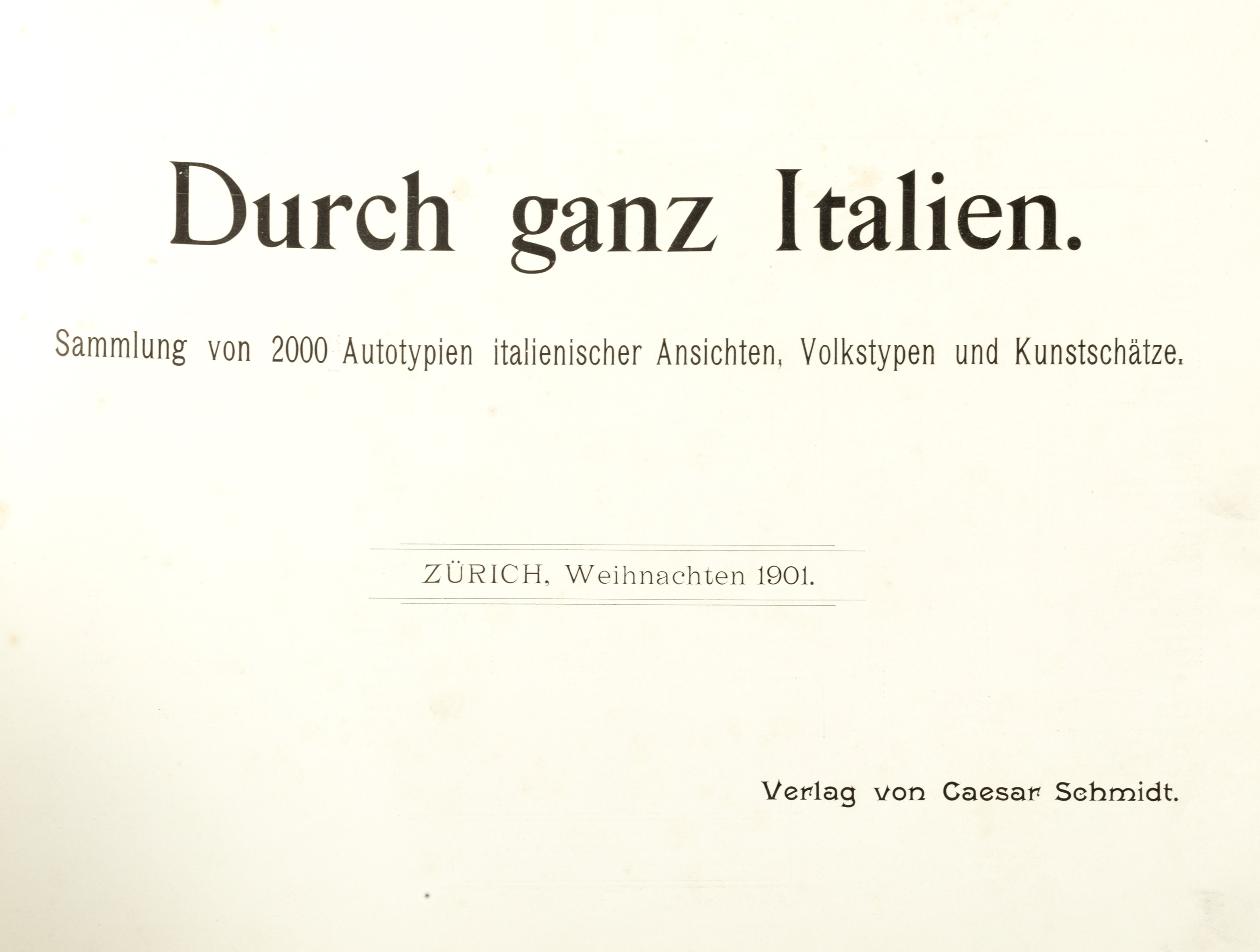 Zurich, Weihnachten, 1901. Verlag von Caesar Schmidt. Album in folio oblungo, pp. 480 con oltre 2000 illustrazioni n.t. da fotografie del tempo raffiguranti paesaggi, vedute, monumenti e opere d'arte italiane, lievi difetti, legatura editoriale in tela, tagli dorati. Copertina a colori disegnata da Honestein, firmata e datata su lastra (1899).