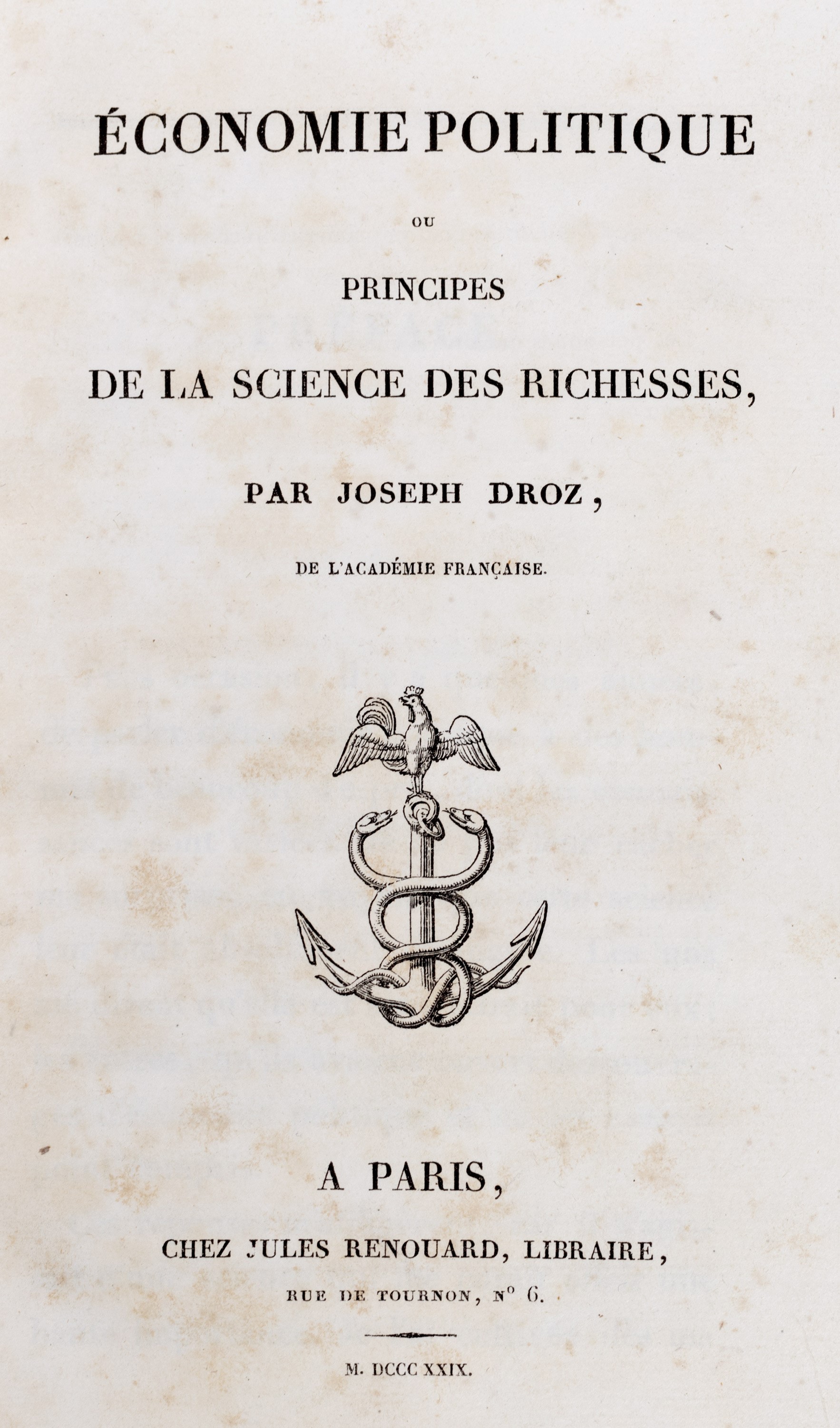 Parigi, Jules Renouard, 1829. In 8°. Fregio al frontespizio, lievi fioriture, legatura coeva in mezzo marocchino e carta marmorizzata, titolo in oro al dorso liscio con eleganti fregi, lievi difetti. § Dello stesso autore, Oeuvres de Joseph Droz, de l'Académie Française, Parigi, Jules Renouard, 1829. In 8°. 2 voll. Ritratto dell'autore in antiporta del I vol., fioriture sparse, gora d'acqua al margine superiore, antiporta parzialmente staccata, ultime carte del II volume con margine sciupato, brossura editoriale, difetti.