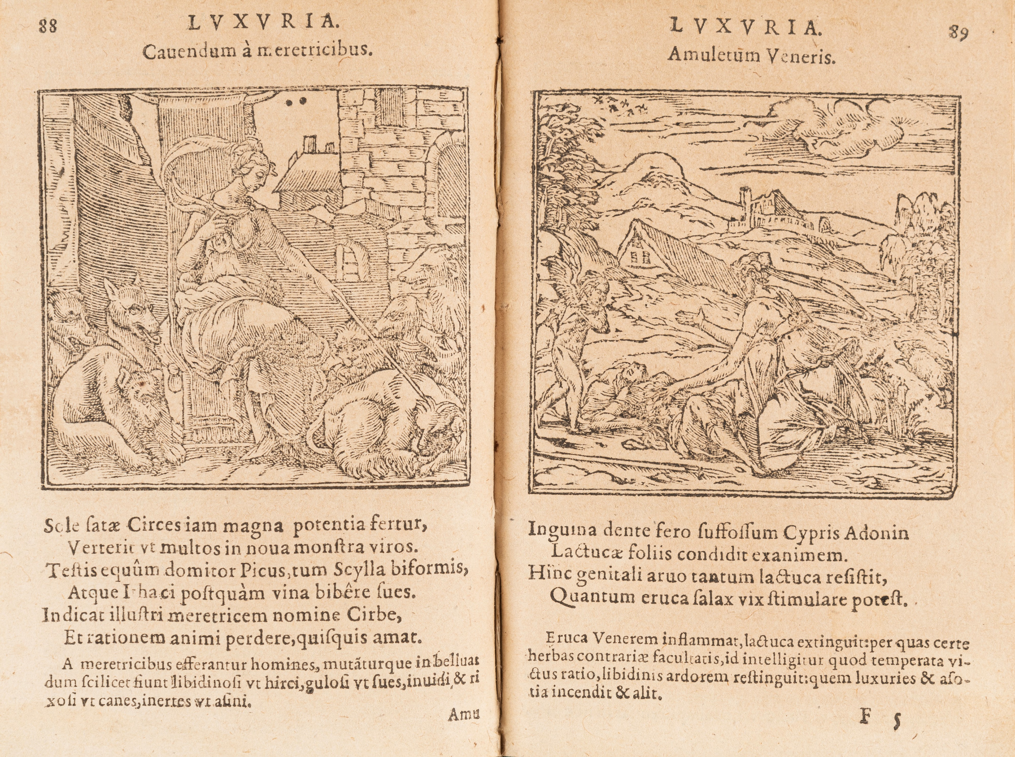 1588 Lione, Rouillé, 1588. In 8°. Marca tipografica al frontespizio, vignette calcografiche con emblemi lungo tutto il testo, bruniture e aloni, legatura in piena pelle del sec.XIX. Ex libris moderno con timbro della biblioteca di Achille Varisco.