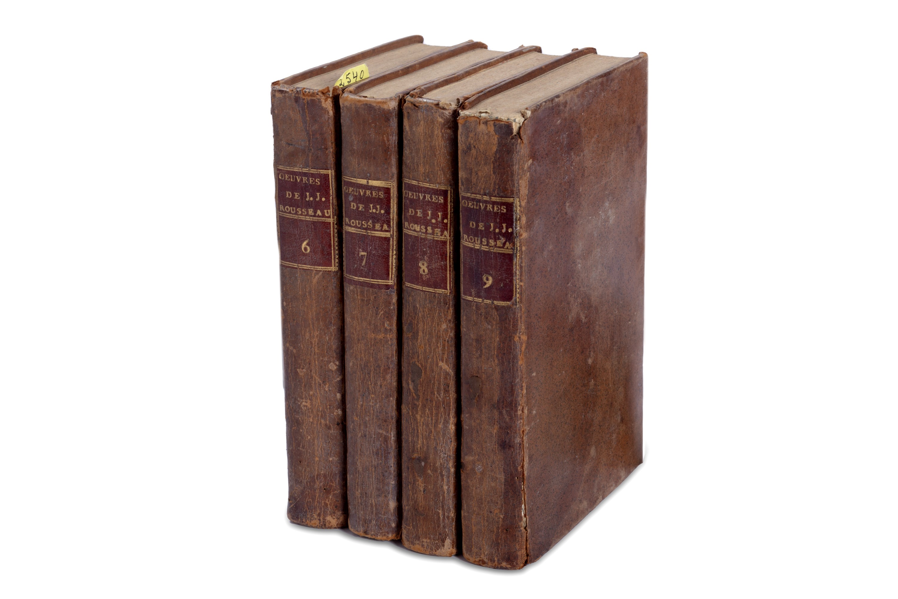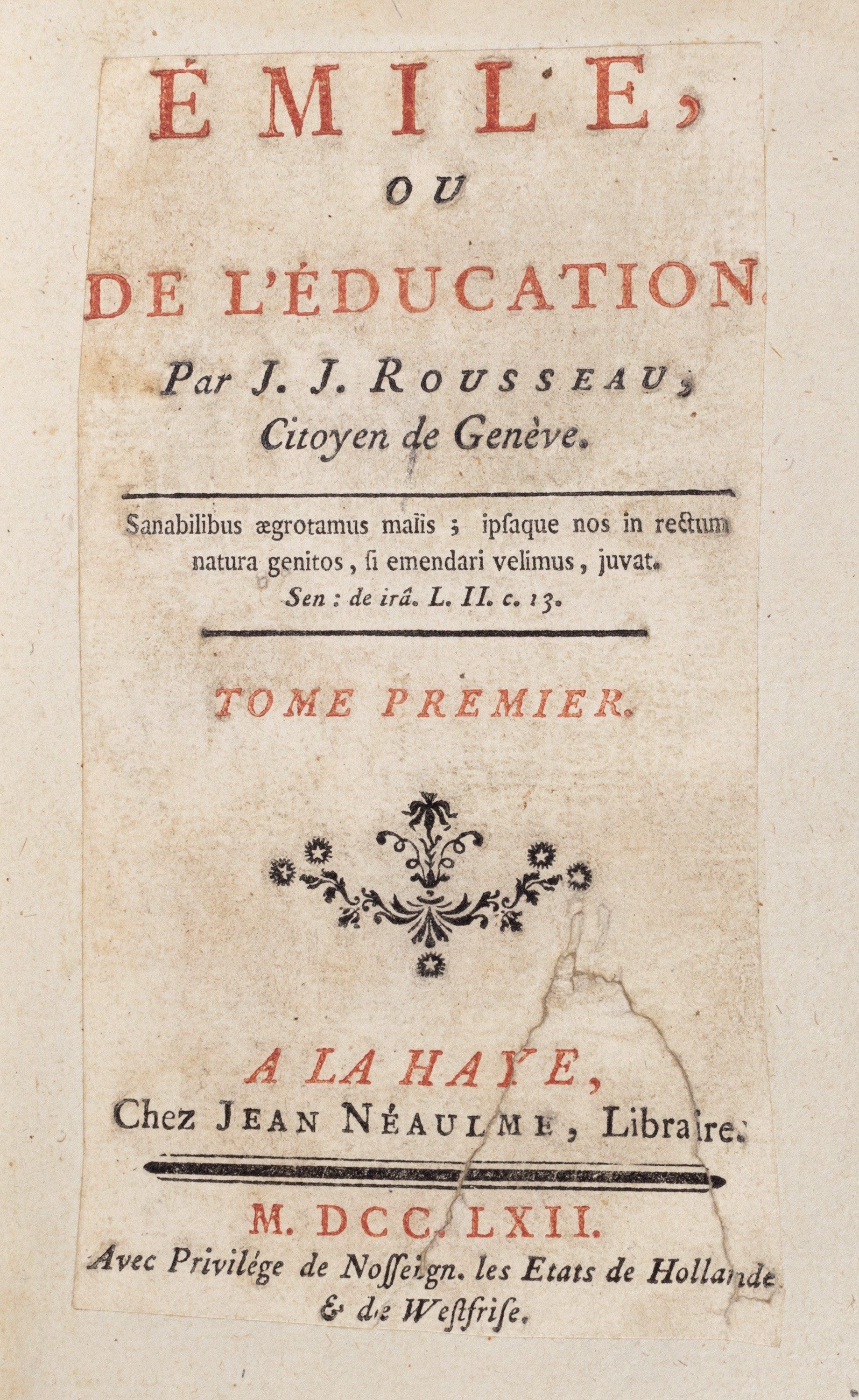 1762 La Haye [Paris], Jean Néaulme [Duchesne], 1762. 4 voll. In 8°. Con 5 tavole di Charles Eisen incise in rame, frontespizi in rosso e nero con fregio xilografico, testatine incise in legno, lievi fioriture, qualche arrossatura, poche carte con leggera brunitura, al I vol. frontespizio fortemente rifilato e con restauro applicato su carta bianca, c. a1 con piccola lacuna nel testo e restauro al margine esterno bianco, al vol. II tavola in antiporta allentata, legatura coeva in pelle, autore, numerazione da 7-9 e titolo impressi in oro entro tassello al dorso, lievi difetti. Ex libris cartaceo al contropiatto.