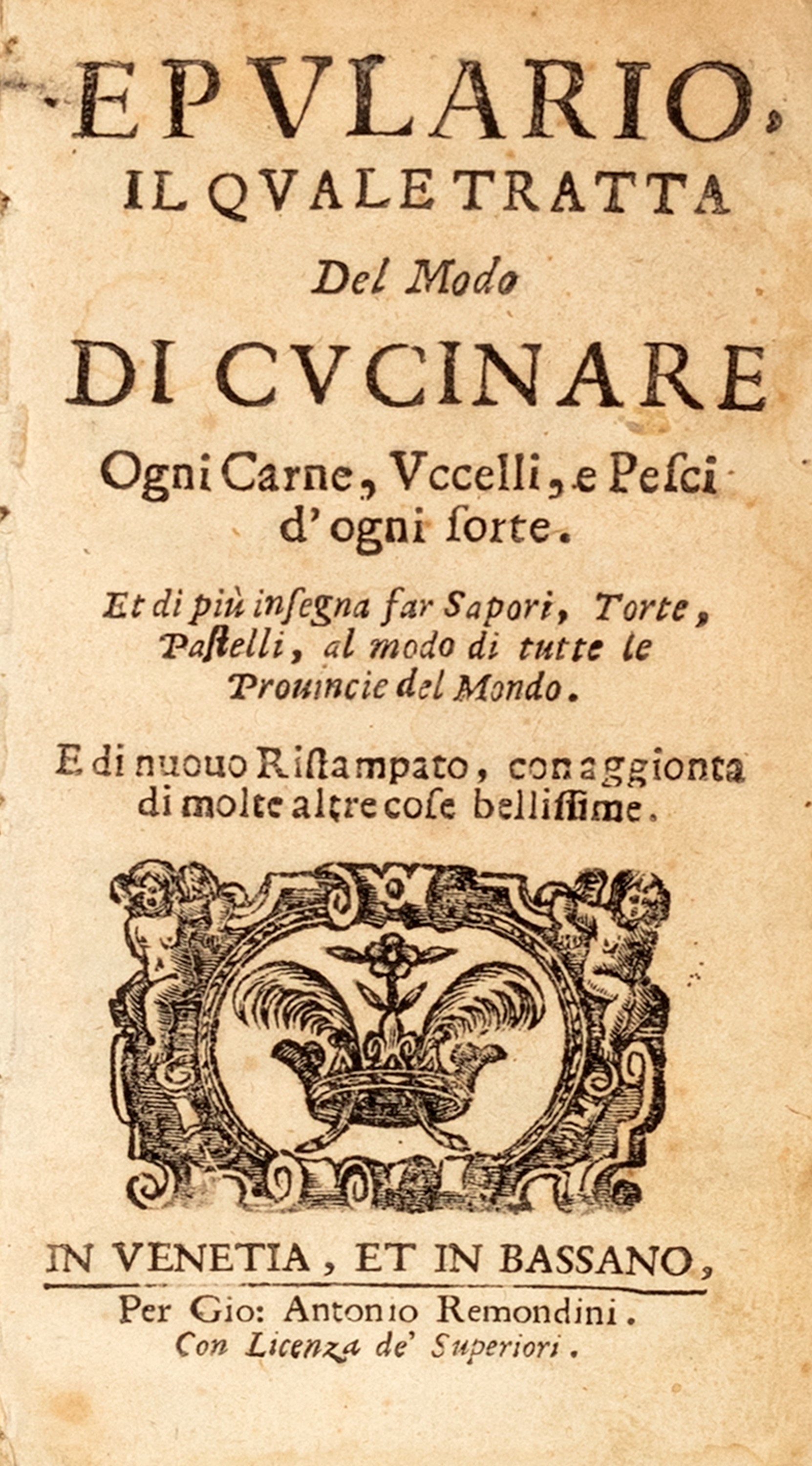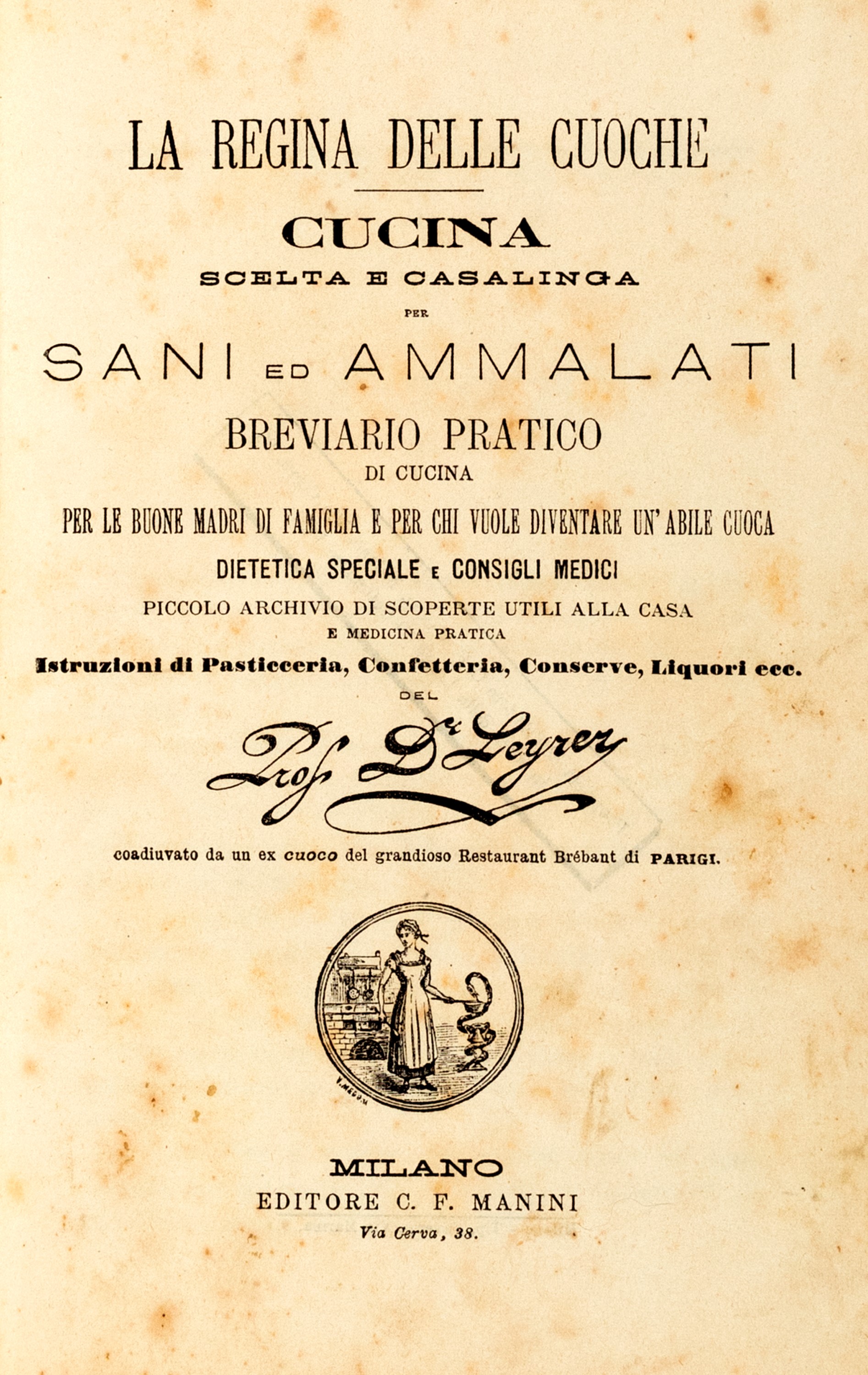 1674 Venezia e Bassano, Gio. Antonio Remondini, s.d. [c.ca 1674]. In 12°. Fregio xilografico al frontespizio, leggera brunitura, qualche lieve fioritura e arrossatura, cerniera interna allentata, legatura coeva in pergamena, lievi difetti. § Insieme nel lotto Leyrer, La Regina Delle Cuoche cucina scelta e casalinga per sani ed ammalati. Breviario pratico di cucina per le buone madri di famiglia e per chi vuole diventare un'abile cuoca, Milano, C.F: Manini, 1882. In 8°. Fregio al frontespizio, illustrazione di un bue a mezza pagina, lievi fioriture sparse, legatura in mezza pelle, titolo impresso in oro al dorso, alcune lacune ai piatti e abrasioni, difetti.