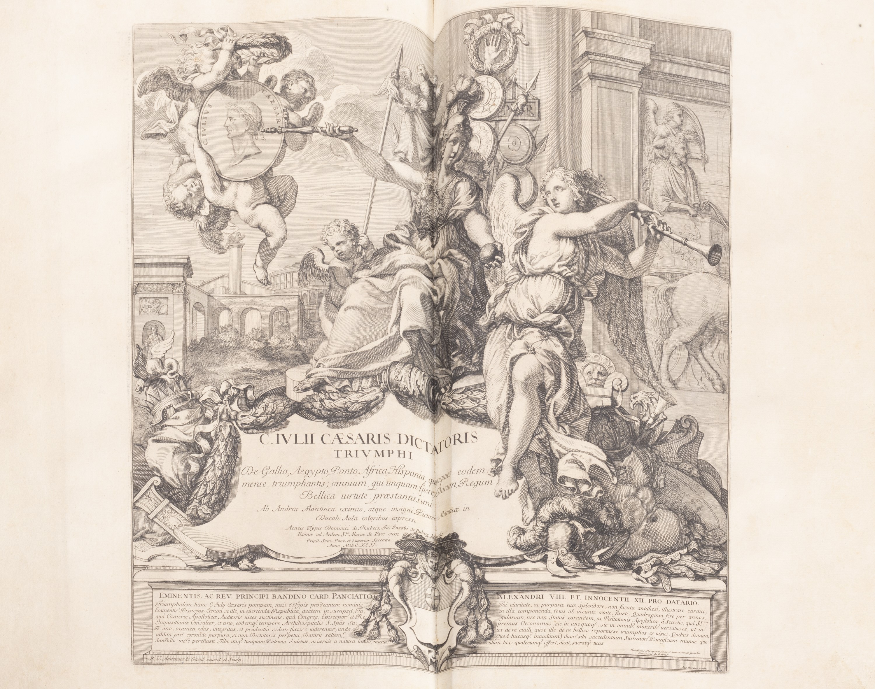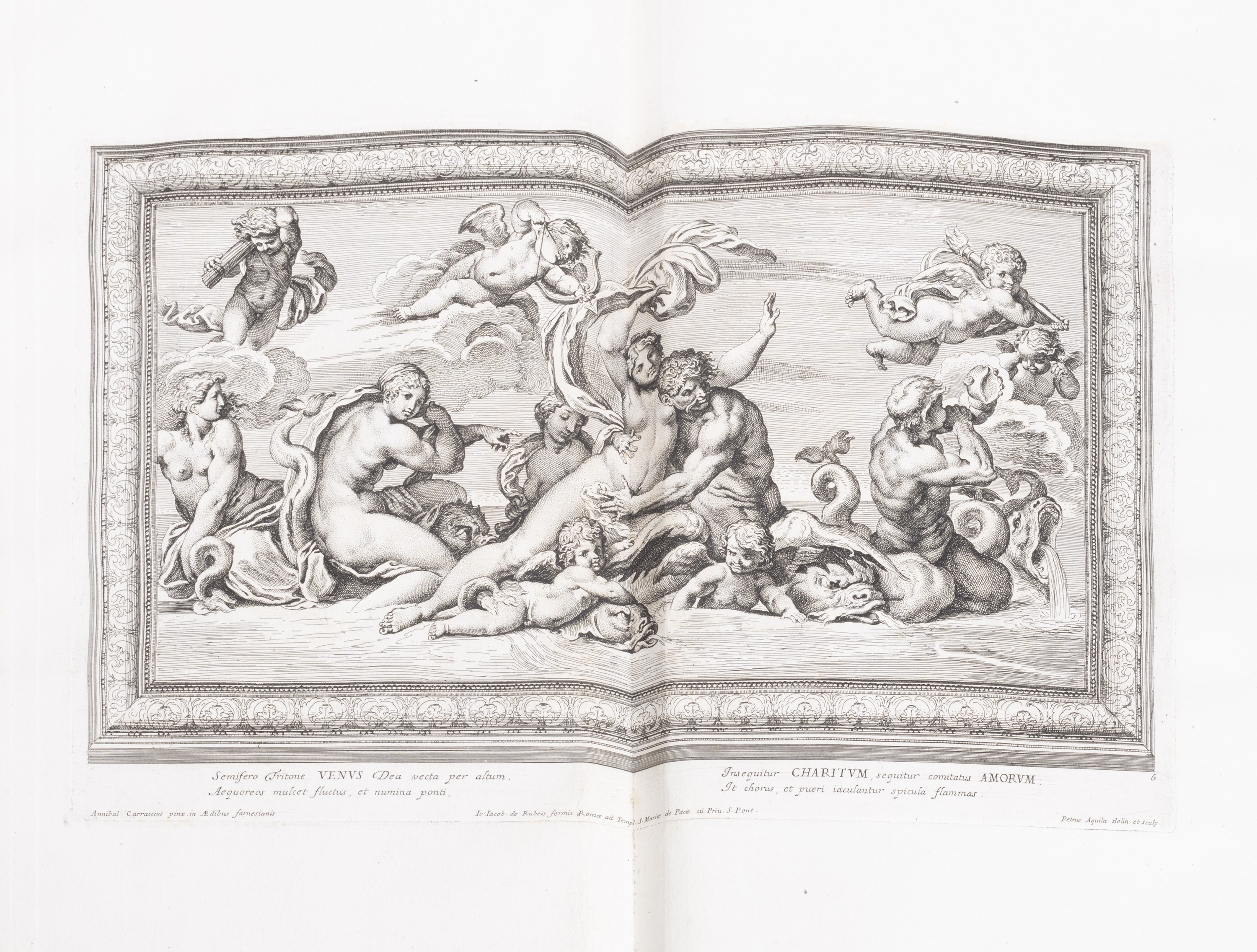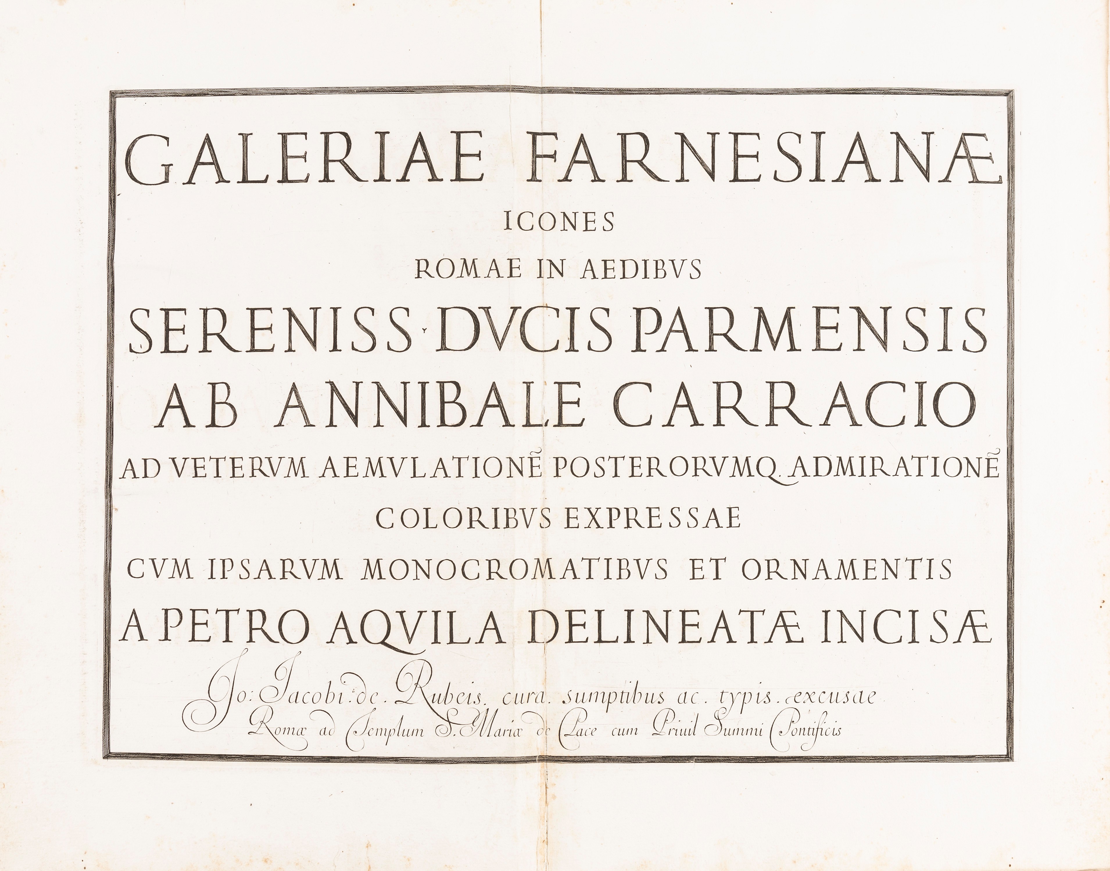 1674 Roma, Giovanni Giacomo de Rossi, 1674. In 2°. 495 x 340 mm. Serie di 25 tavole a bulino numerate, accompagnata da versi di Giovanni Pietro Bellori riproducenti la galleria di Palazzo Farnese e precedute da quattro tavole non numerate costituite da: frontespizio, dedica, allegoria con Annibale Carracci che risolleva le sorti della pittura e monumento funebre ad Annibale Carracci, lievi fioriture marginali. Legato con. Robert van Audenaerd. C. Iulii Caesaris dictatoris triumphi de Gallia, Aegypto, Ponto, Africa, Hispania. Roma, Domenico de Rossi, 1692. Serie di 10 stampe, acquaforte e bulino, compreso il frontespizio, con numerazione progressiva, riproducenti il ciclo di dipinti del Mantegna Il trionfo di Giulio Cesare, realizzato per il Palazzo Ducale di Mantova, dedica al cardinale Bandino Panciatici, carta brunita uniformemente. Bella legatura coeva in vitello biondo con doppia cornice a triplice filetto ai piatti, elementi decorativi geometrici, dorso a 7 nervi con riquadri dorati e titolo in oro su scomparto superiore, spellatura e difetti, cuffia superiore consumata.