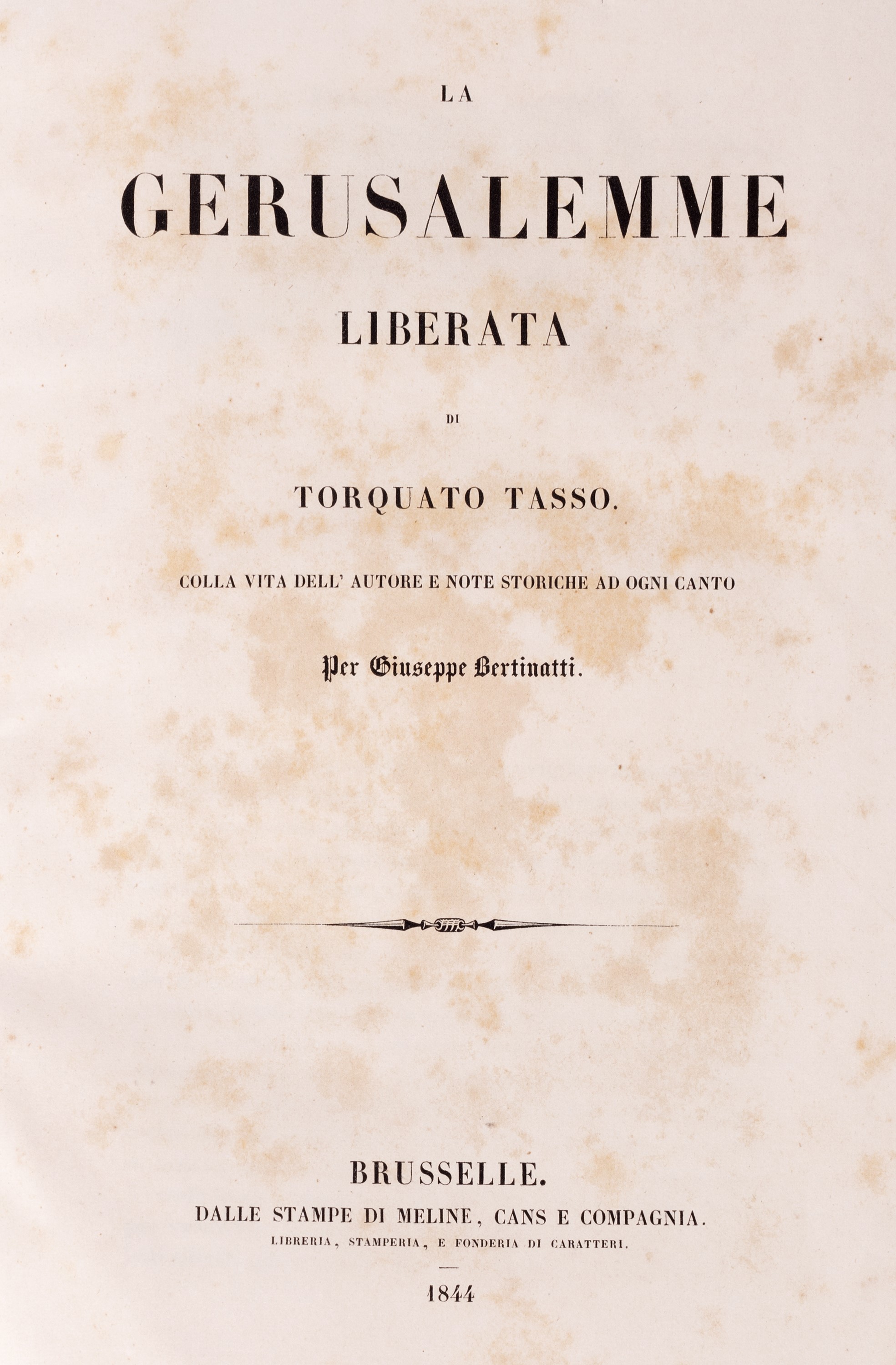 1844 Brusselle, Meline, Cans & C., 1844. In 8°. All'antiporta ritratto del Tasso a piena pagina, illustrazioni nel testo e illustrazioni nel testo ed a piena pagina e protette da veline brunite, fioriture ed arrossature, legatura in mezza pergamena con tassello in pelle verde con autore e titolo in oro, difetti .