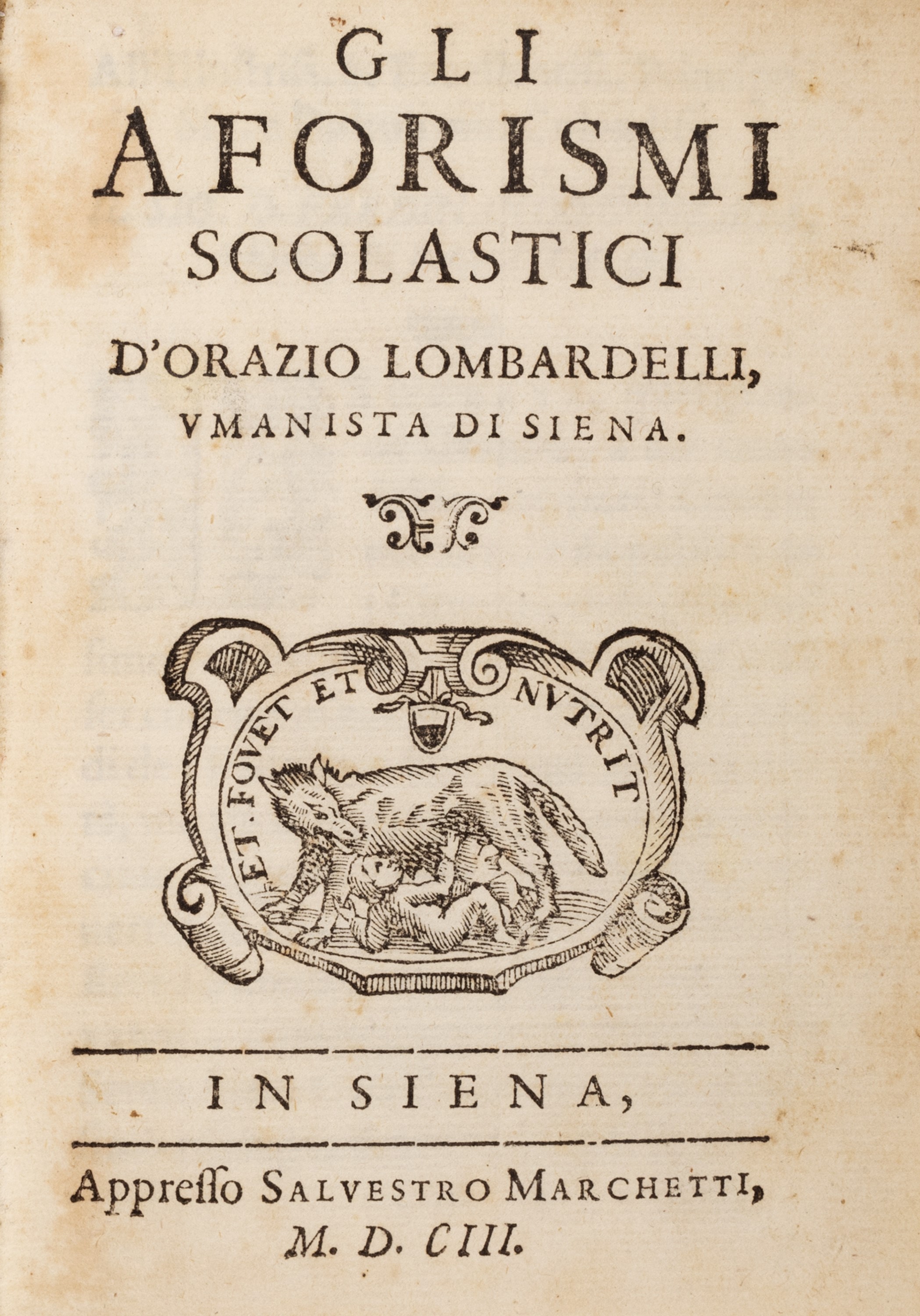 16°. Marca tipografica al frontespizio e al colophon, lievi difetti, legatura coeva in mezza pelle con angoli, cordoni, tassello, titoli e fregi in oro al dorso.