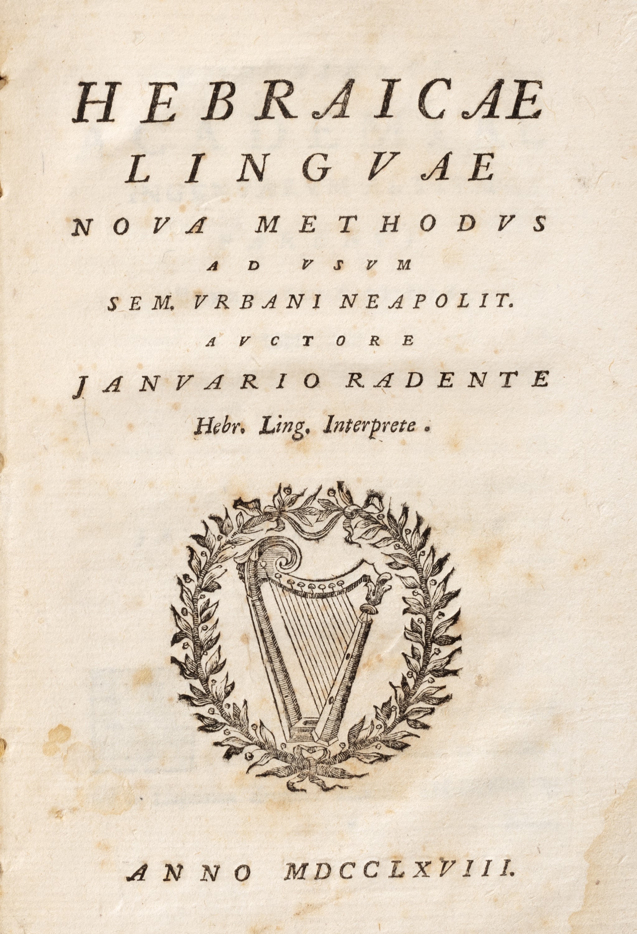 Napoli, Typis edidit Ioseph Raymundi, 1768. In 8°. Vignetta incisa su rame al frontespizio. Legato con: Exercitatio in biblica De Jesu Christo Vaticina. Appositis versionibus graecanica et latina Xanti Pagnini. Napoli, 1768. Lievi difetti, legatura in cartonato rustico coevo. Esemplare intonso.