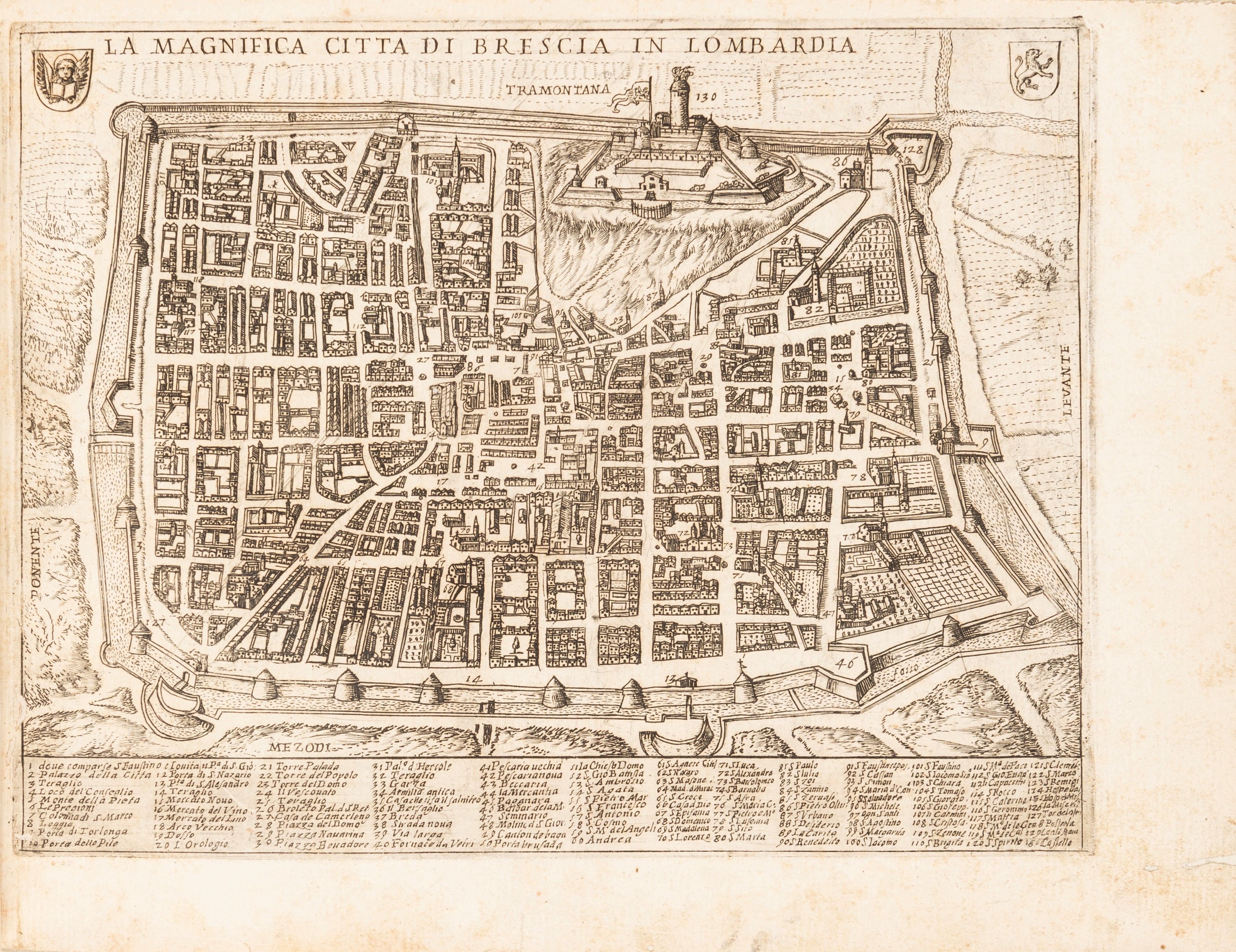 1645 Roma, Appresso Lodovico Grignani, 1645. In 2° oblungo. 280 x 218 mm. misure del fascicoletto, Splendida pianta della città di Brescia, acquaforte di 240 x 182 mm., con una ricca legenda relativa a piazze, torri, chiese e monumenti notabili, seguono due carte descrittive della Città di Brescia, del suo territorio, dei laghi e fiumi, degli uomini illustri e delle famiglie nobili.