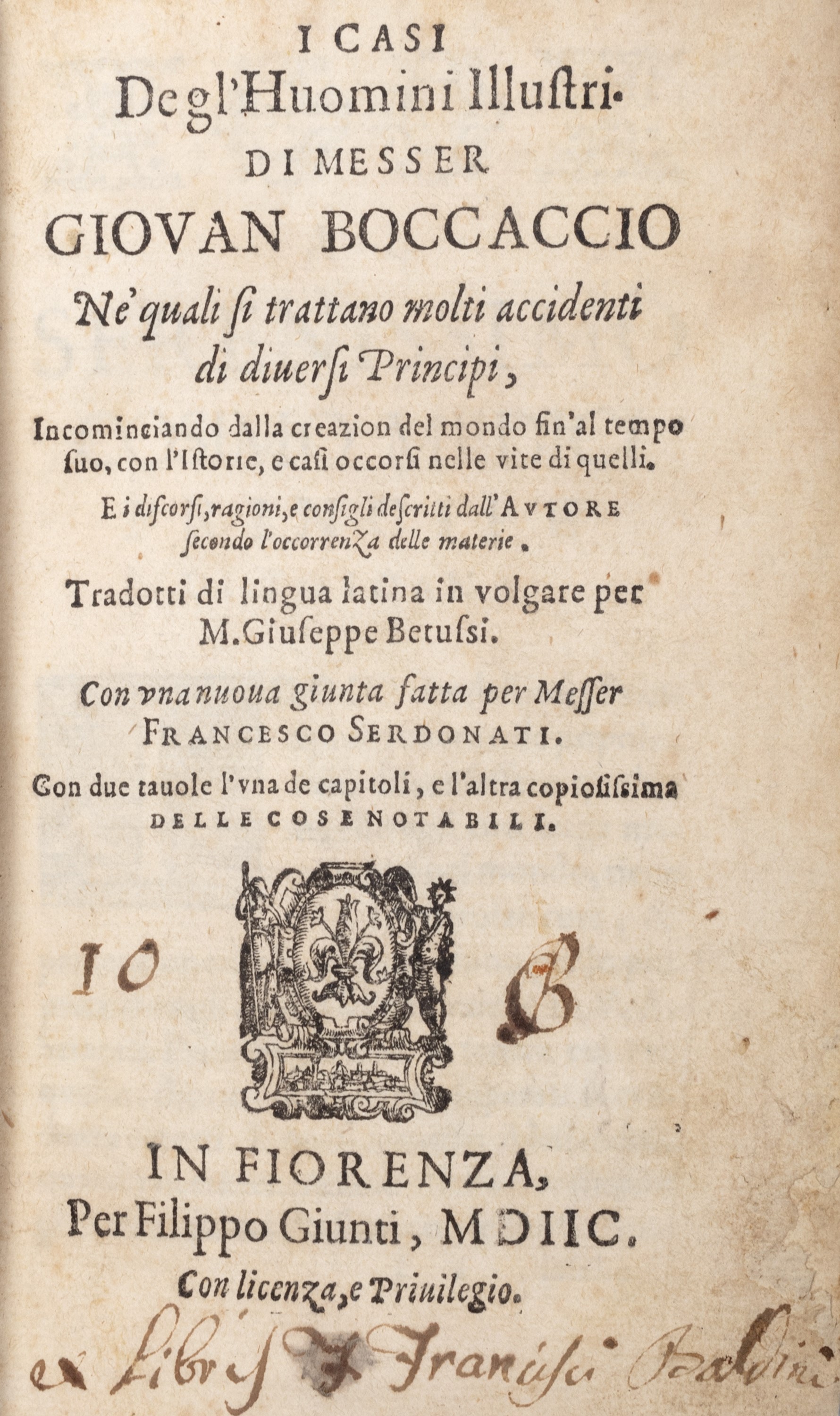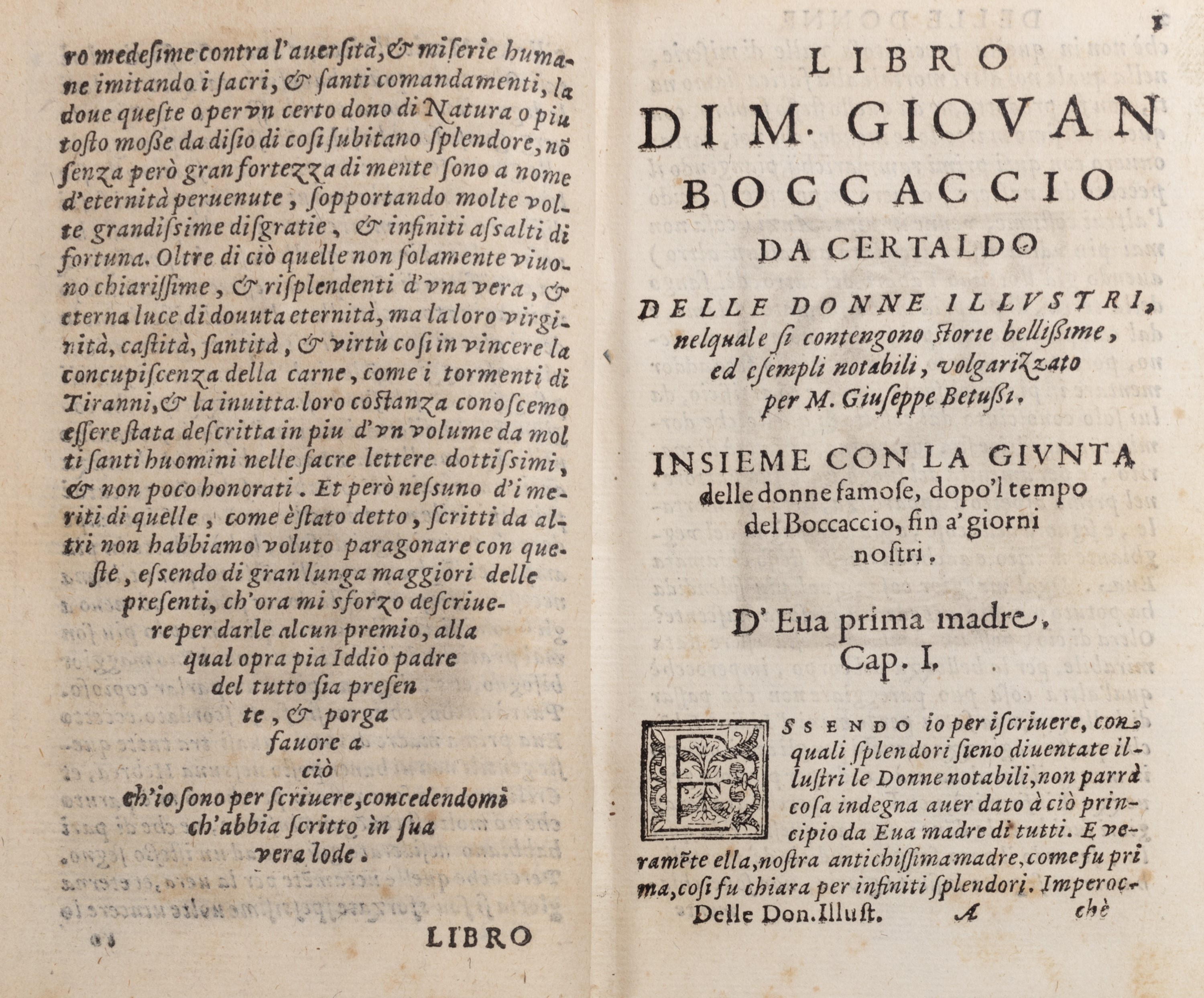 1598 Firenze, Filippo Giunti,1598. In8°. Marca tipografica di Filippo Giunti, capilettera xilografici, al margine del frontespizio picco lacuna che non lede lo specchio di stampa, bruniture leggere, qualche macchia, legatura dell'epoca in pergamena, al dorso liscio titolo manoscritto, lievi macchie. Al frontespizio firma di appartenenza di mano antica. § Libro [...] delle donne illustri. Firenze, Filippo Giunta, 1596. In8°. Marca dello stampatore al frontespizio e in fine, ritratto dell'Autore a carta +8v, e ritratto di donna a carta 2V4r, il tutto xilografico, fioriture, difetti al frontespizio, leggera brunitura, legatura dell'epoca in pergamena, al dorso liscio titolo manoscritto, lievi difetti.