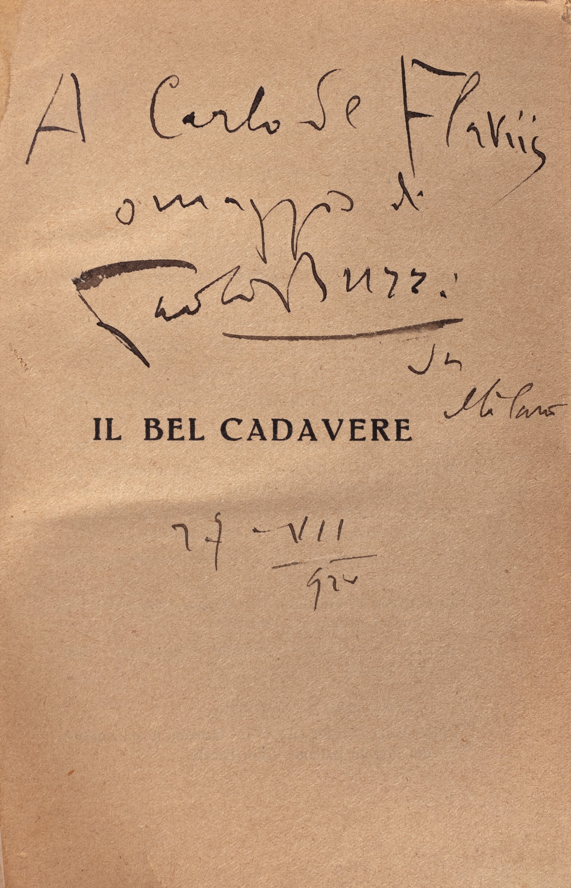 Milano, Facchi editore, 1920. In 8°, pp. 347-(5). Legatura mezza pelle con angoli, titoli e fregi in oro al dorso, copertine originali conservate, lievi difetti. Dedica autografa dell'autore all'occhietto al commediografo, novelliere, giornalista e poeta dialettale napoletano Carlo De Flavis.