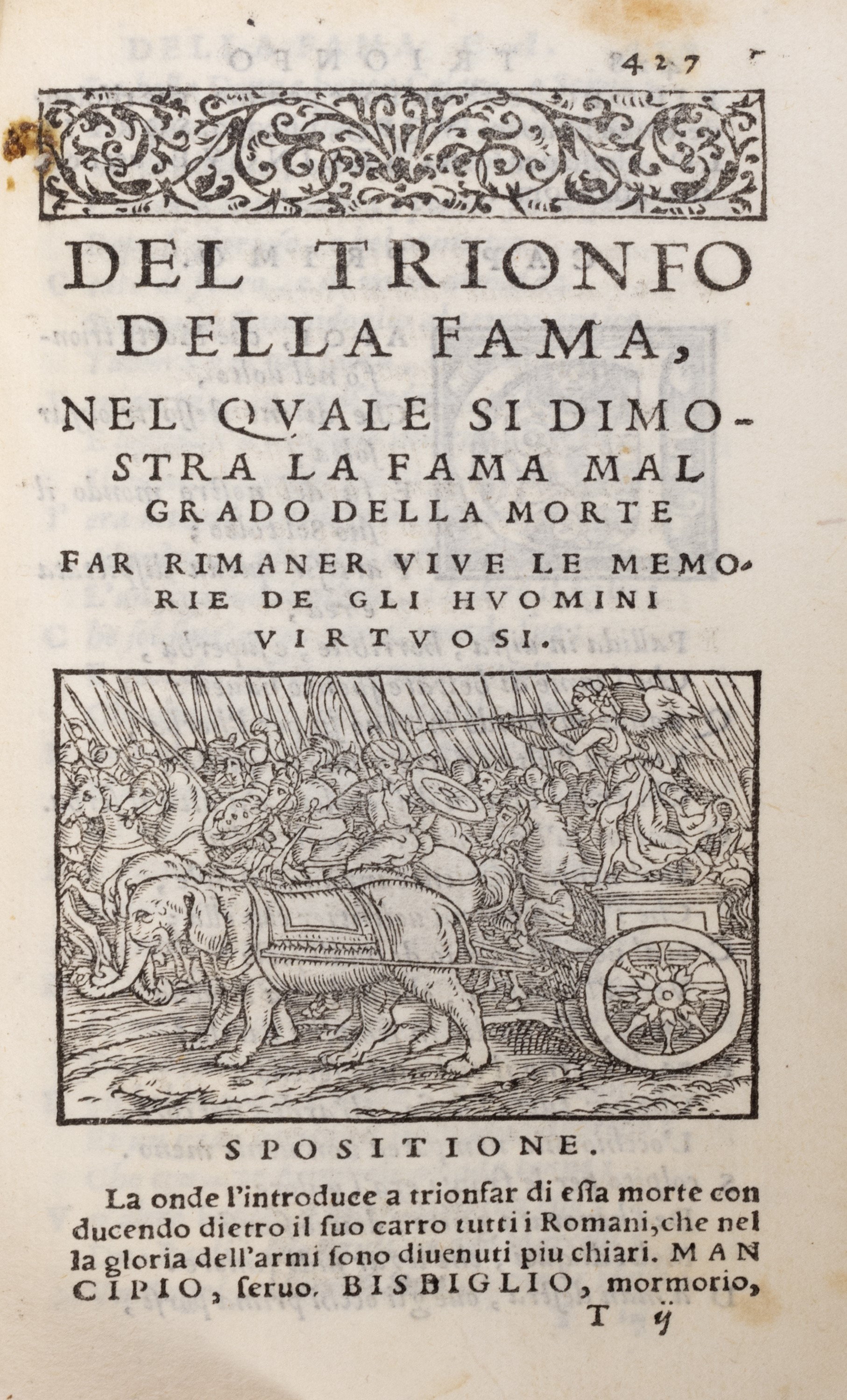 Venezia, Gabriel Giolito de Ferrari, 1556. In 12°, 3 parti in un volume. Due ritratti, in ovale, di Laura e Francesco e sei vignette, poste all'inizio di ogni Trionfo, capilettere istoriati, il tutto inciso su rame, marca tipografica ai frontespizi, lievi difetti, legatura in piena pergamena marmorizzata, titolo in oro al dorso.