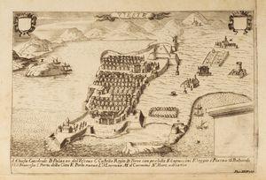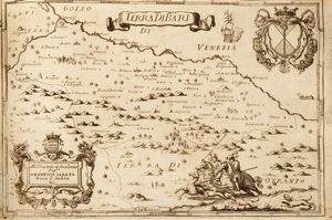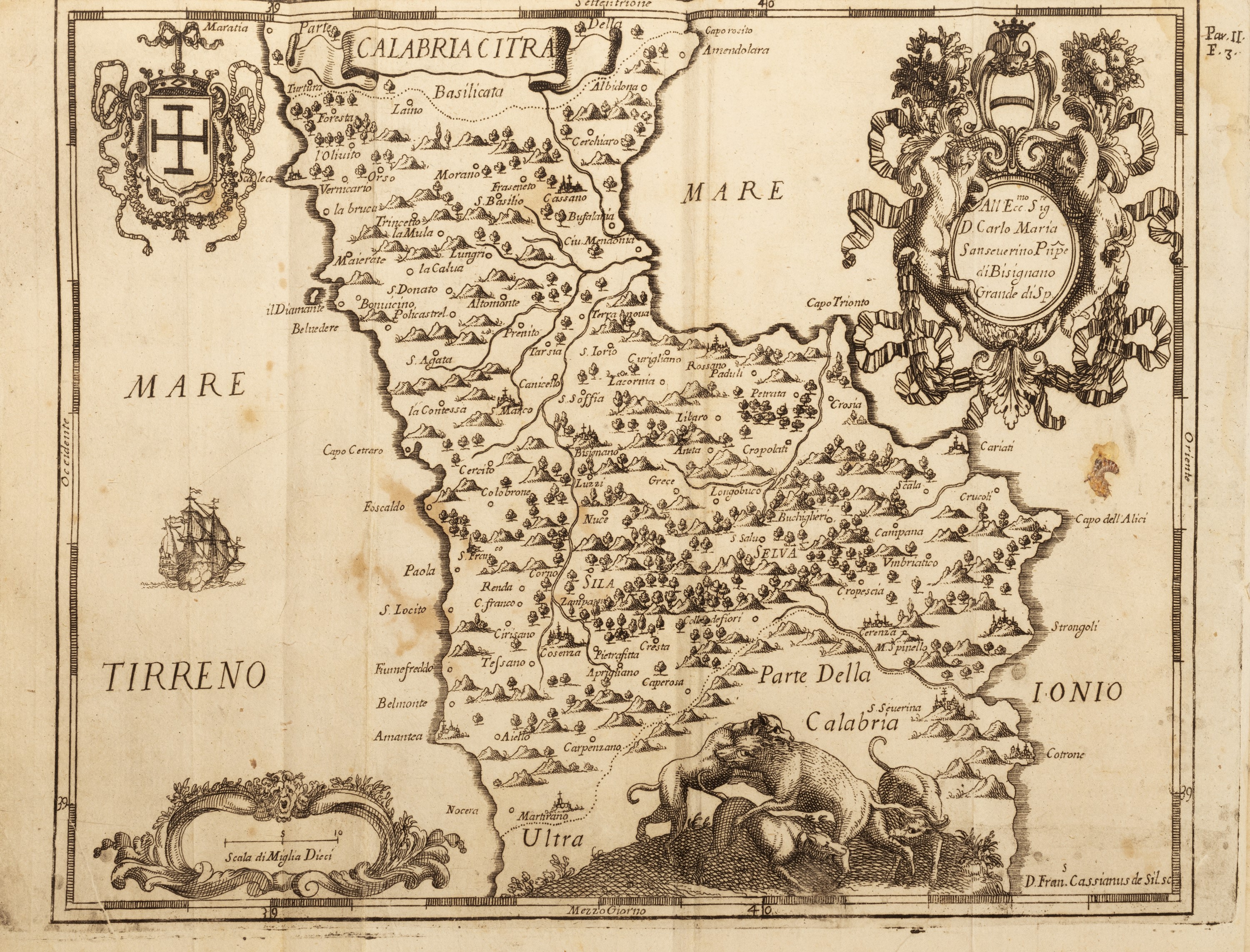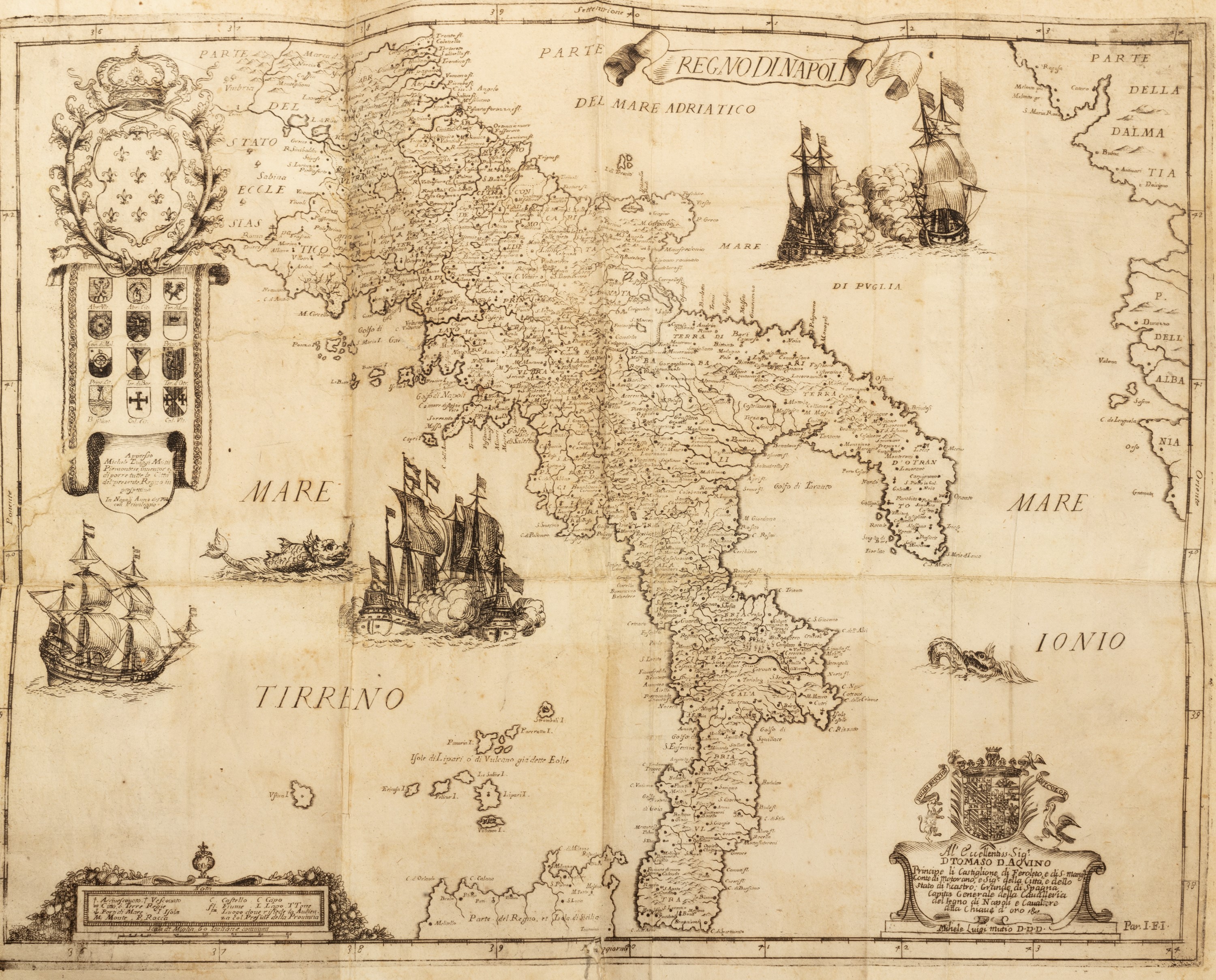 Napoli, Nella Stamperia di Michele Luigi Mutio/D.A. Parrino,. In 8°. 3 voll. Antiporta raffigurante Nettuno che emerge dal mare, pp. (12)-340; (8)-256; (8)-267 con 13 carte geografiche (Regno di Napoli e le 12 province), una veduta di Napoli in prospettiva e 160 vedute (ce ne sono 10 in più rispetto all'indice che ne riporta 152 considerando riportata due volte Oppido) per complessive 173 tavv.. Vol.I: 71 tavole e 5 carte geografiche ripiegate; Vol.II: 58 tavole e 4 carte geografiche ripiegate; Vol.III: 32 tavole e 4 carte geografiche ripiegate. Questo esemplare contiene una tavola in più rispetto a tutte le altre, ovvero la tavola che raffigura la Città di Monte Sant’Angelo. Legatura in piena pergamena, titolo calligrafico.