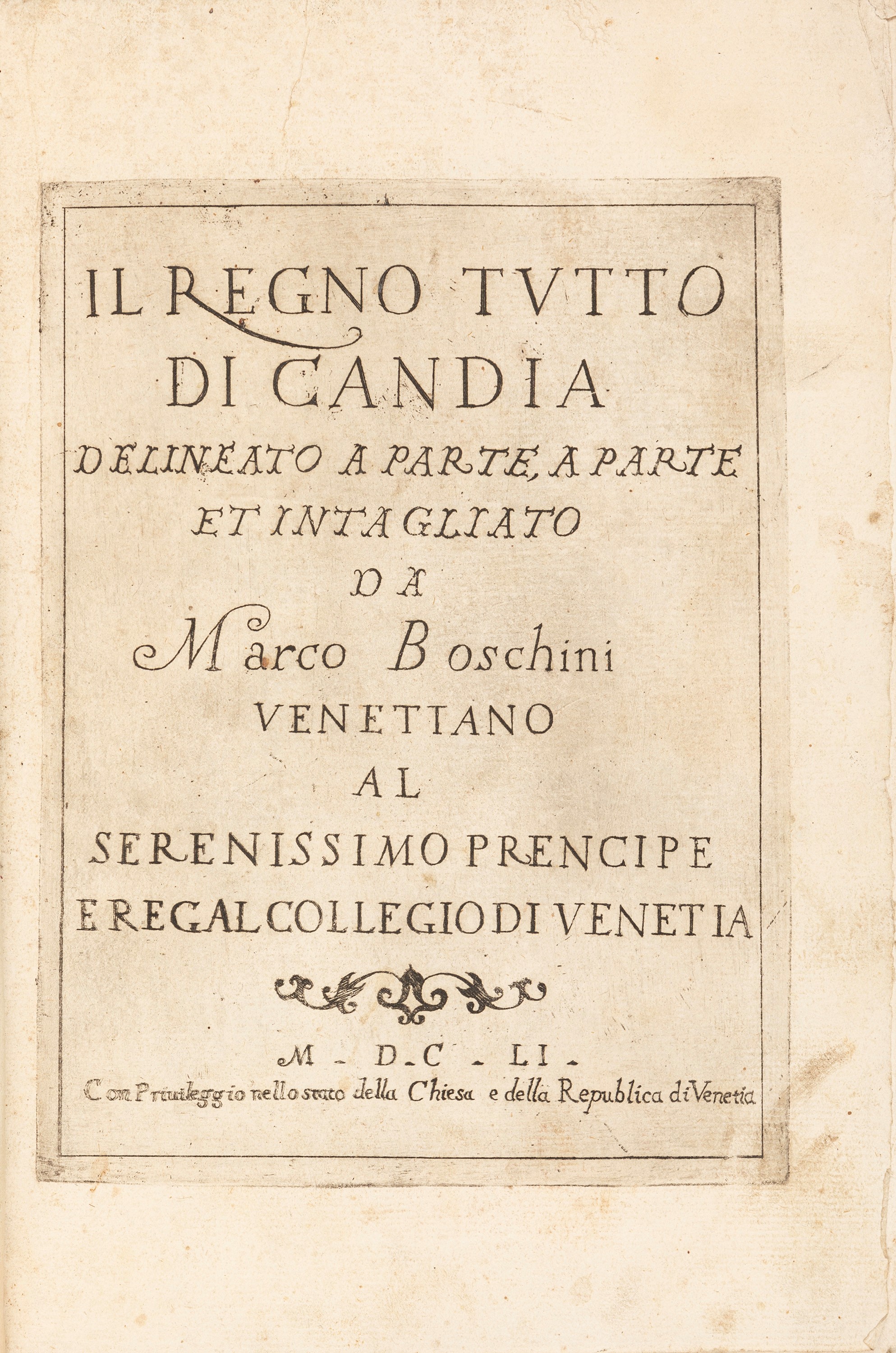 Venezia, 1651. In folio. 3 carte che includono frontespizio, dedica e antiporta raffigurante il Leone di San Marco che troneggia sull'Isola di Creta, seguono 61 tavole calcografiche numerate con piante, mappe e vedute di cui 9 a doppia pagina e ripiegate e le rimanenti a piena pagina, qualche alone arrossature e fioriture, legatura in mezza pergamena del sec. XX.