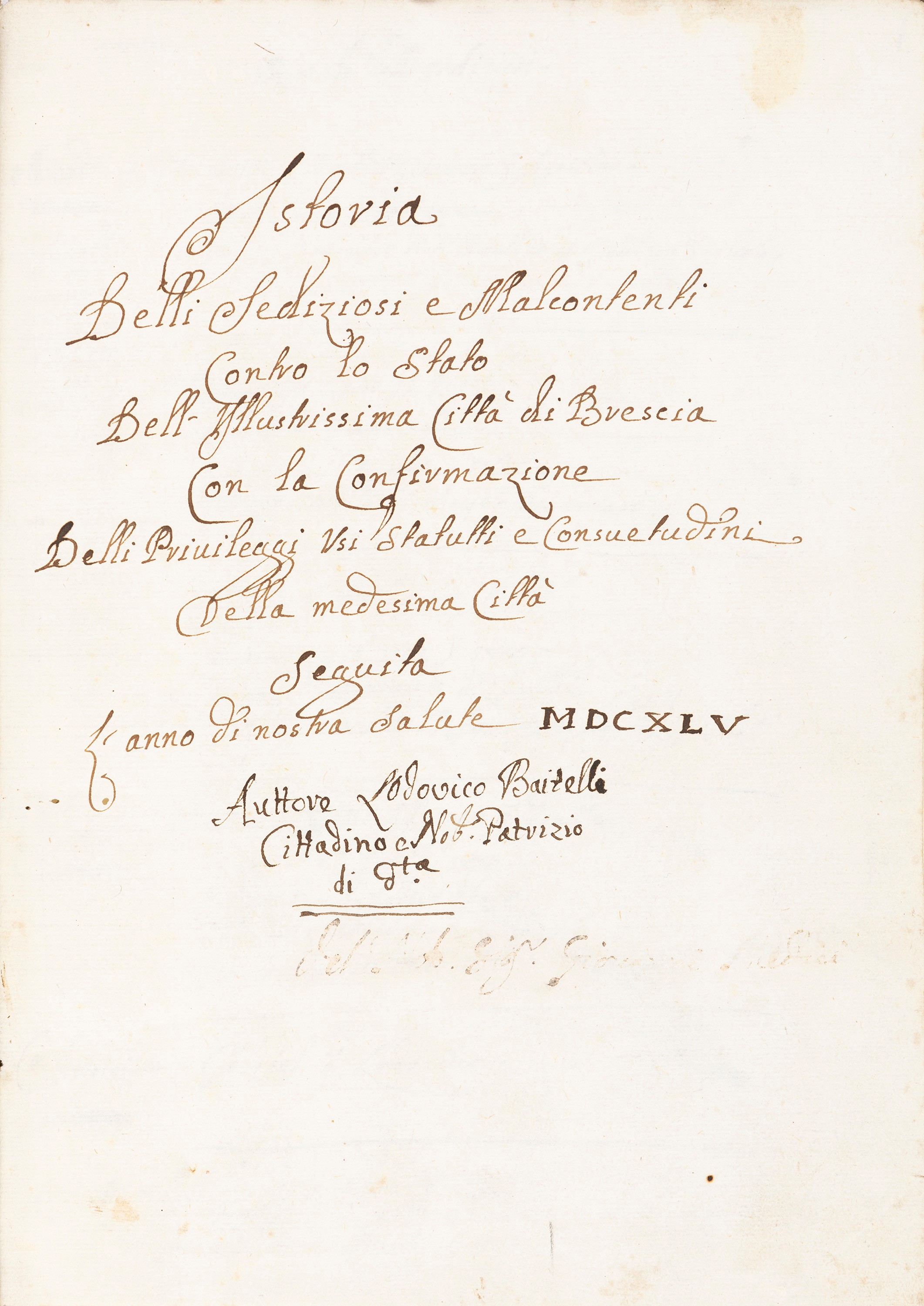 1645 Manoscritto cartaceo datato 1645, 285 x 205 mm., di 168 cc. numerate (non la I che reca il frontespizio calligrafico), vergate in elegante cancelleresca da un'unica mano, occasionali lettere iniziali calligrafiche, legatura in cartone alla rustica. Ex libris al contropiatto del Conte A. Suardo.
