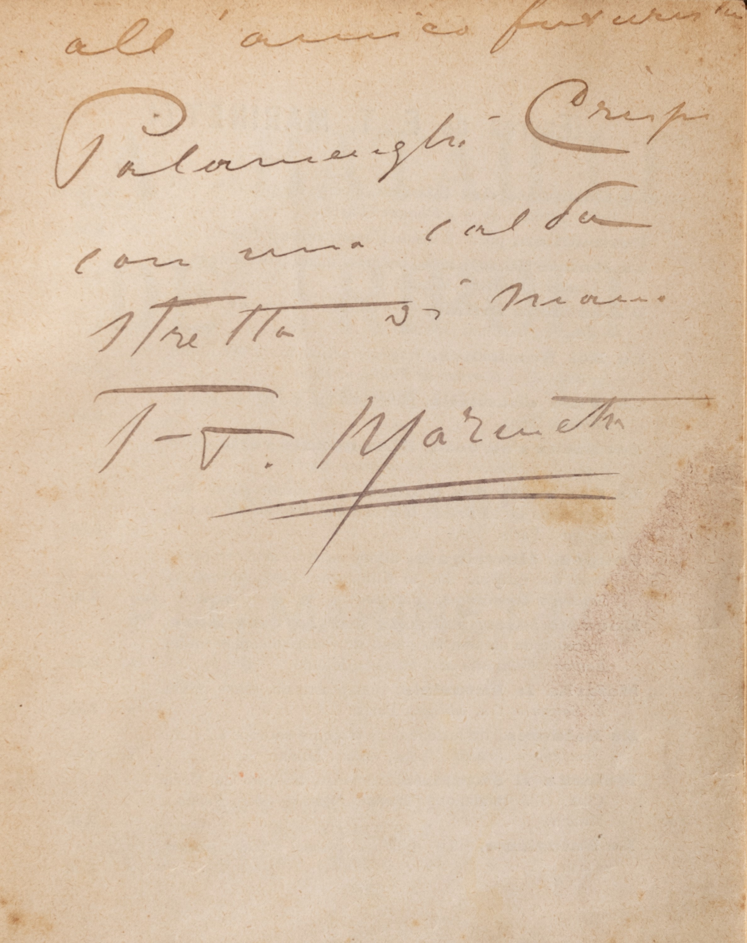 8°, pp. (8)-82. Cartonato varese coevo. Dedica autografa di Marinetti all'amico futurista Tommaso Palamenghi Crispi. Lievi difetti.