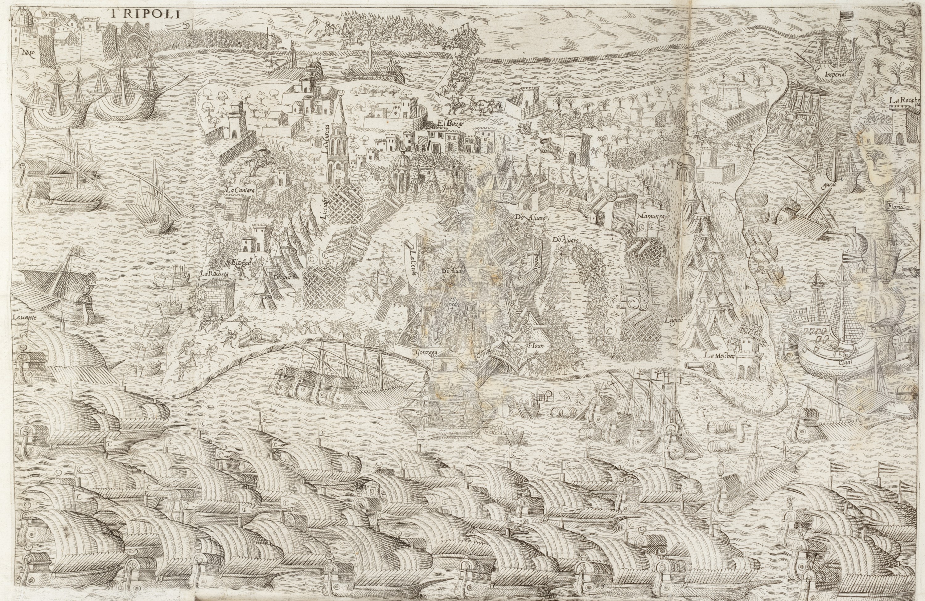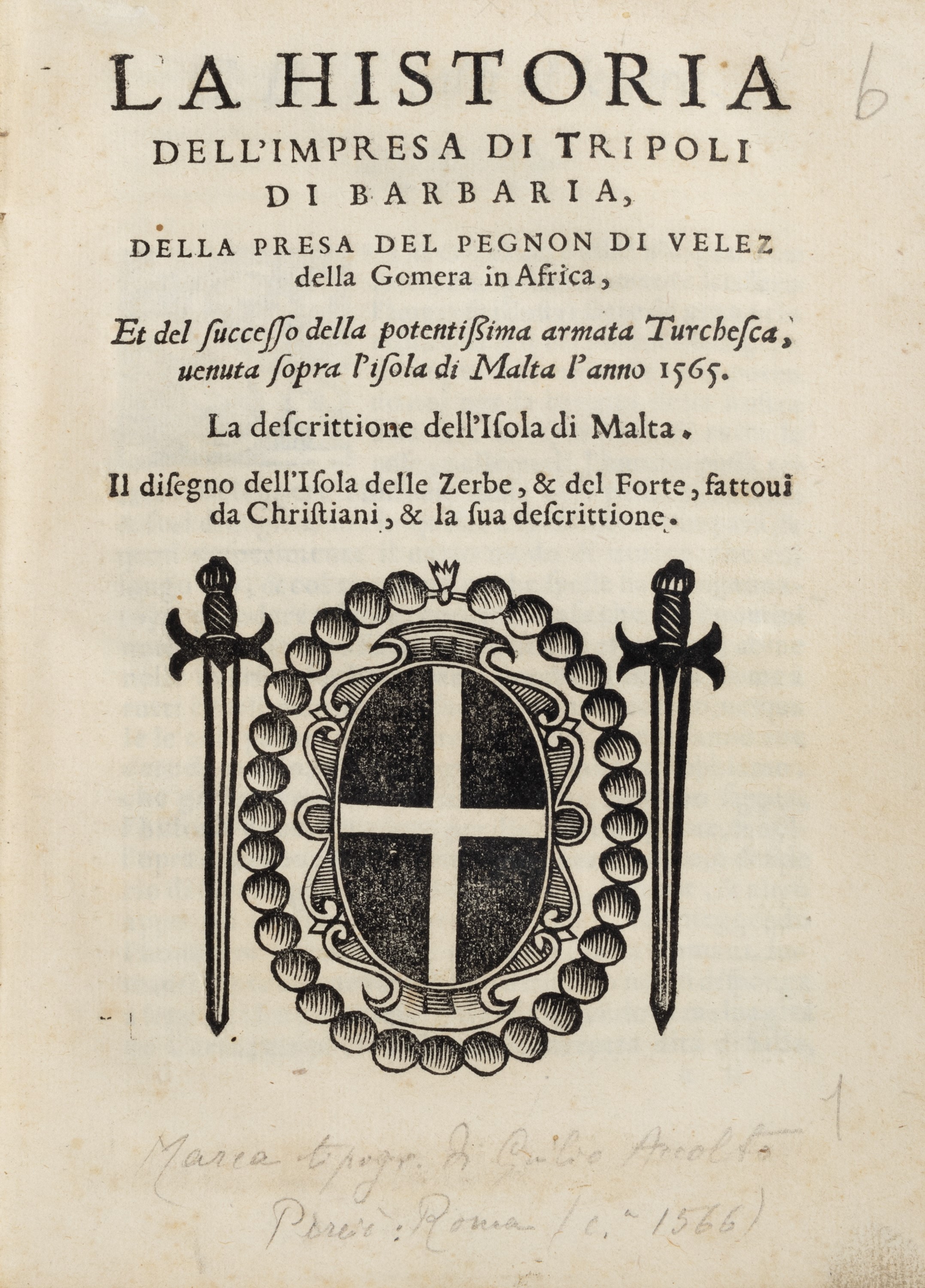 s.l.n.d. In 4°. Impresa dei Cavalieri di Malta incisa in legno al titolo, capilettera figurati, tavola incisa con la veduta dell'impresa di Tripoli alla carta*,l nome del curatore G. B. Tebaldi a carta a2r, annotazioni di studio a matita al contropiatto anteriore ed al foglio di guardia, lieve lacuna al margine inferiore di carta n. 60, legatura in pergamena posteriore, lievi difetti.