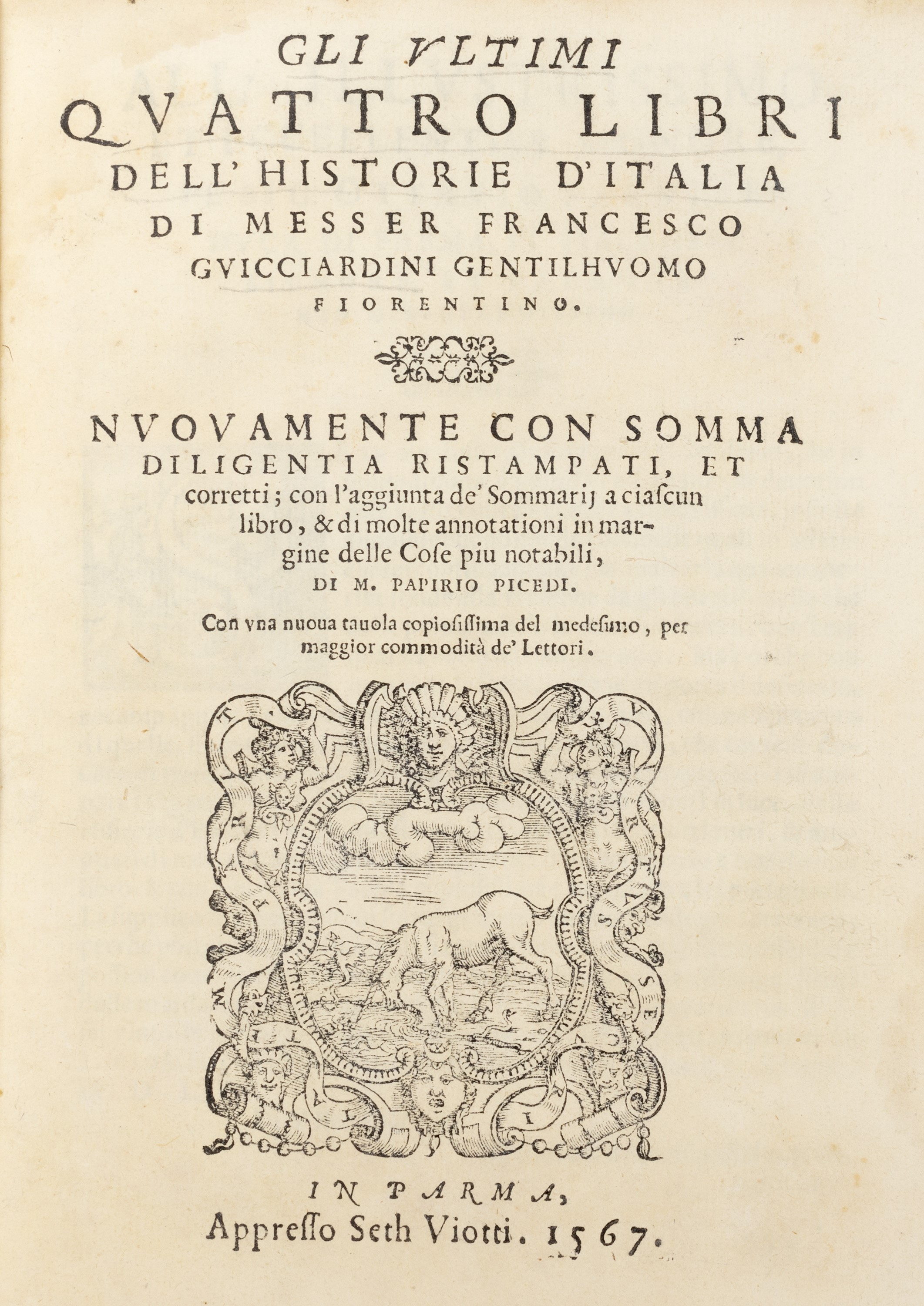1567 Venezia, Niccolò Bevilacqua, 1568 [al colophon 1567] e Parma,Seth Viotti, 1567, quest'ultimo intitolato Gli ultimi quattro libri dell'Historie d'Italia. In 4°. 2 voll. Marca tipografica incisa in legno ai frontespizi e al colophon del I vol., capilettera e fregi xilografici, qualche sottolineatura e glossa di mano antica, I vol. con lieve gora d'acqua al margine delle prime due carte del I vol., piccolo foro di tarlo al margine di pochi fascicoli, leggermente rifilato leggera brunitura, rare fioriture marginali; II vol. alcuni fori di tarlo che interessano il testo, qualche leggera gora d'acqua, legatura in pergamena di epoca successiva, autore e titolo impresso in oro entro tassello ai dorsi. Al I vol. firme di appartenenza cancellate al frontespizio, carta di guardia manoscritta