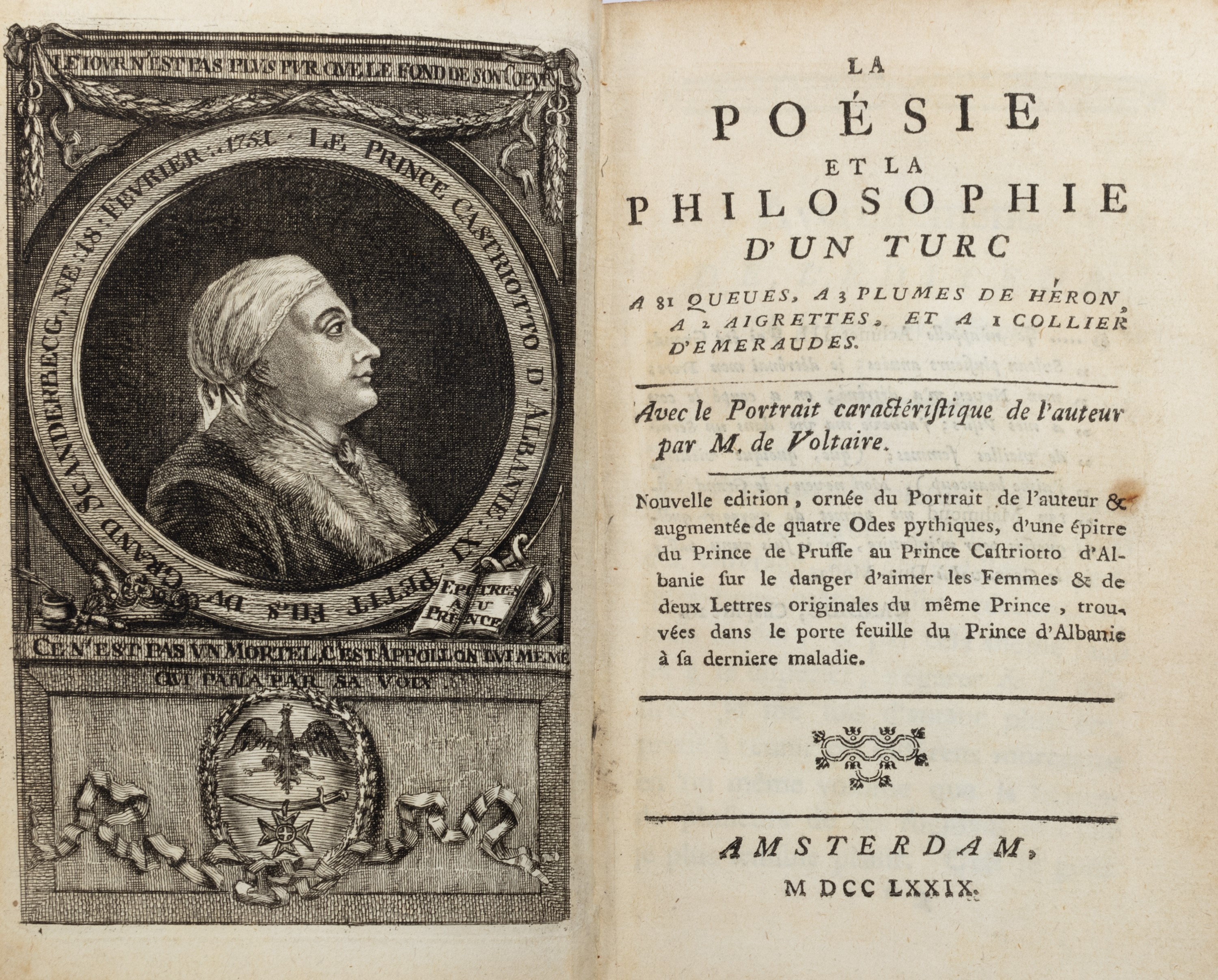 1779 Amsterdam, 1779. In 8°. Antiporta con ritratto dell'autore Prince Castriotto d'Albanie, pseudonimo di Stefano de Zannowich, leggera brunitura, rinforzo al margine interno di p. 225, legatura moderna in cartonato rigido.