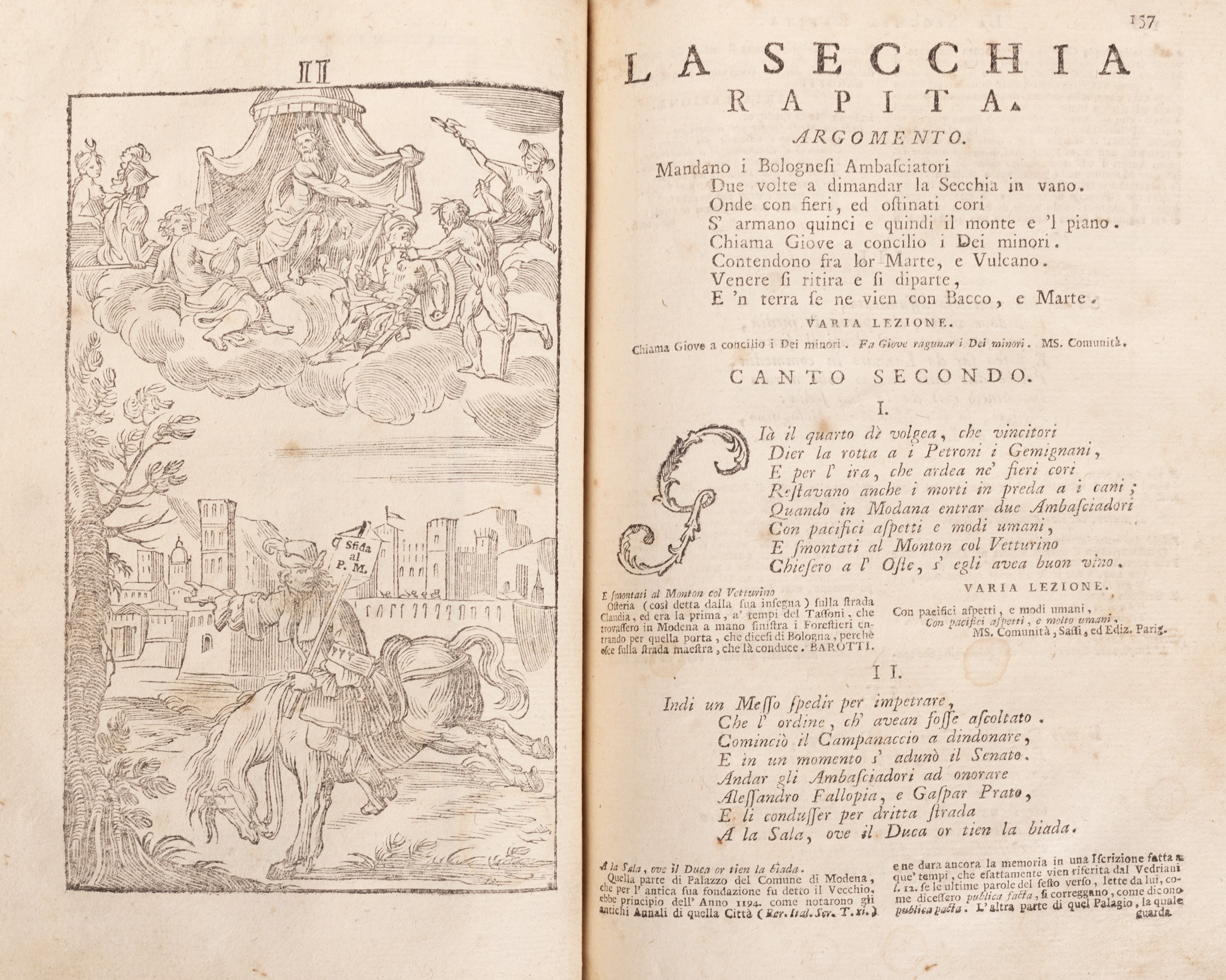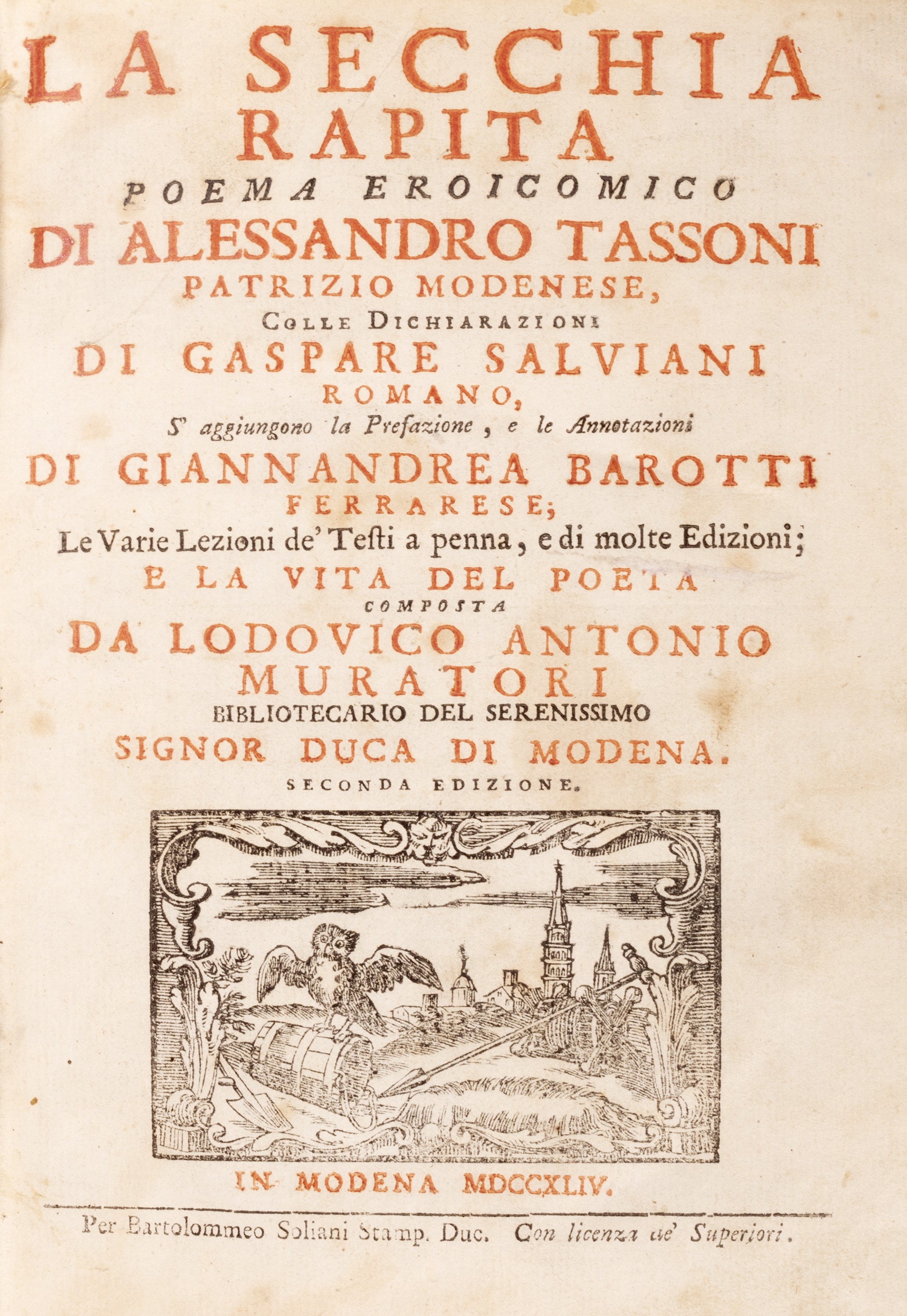 Modena, Per Bartolomeo Soliani, 1744. In 8°, frontespizio stampato in rosso e nero con vignetta incisa in rame, pp. (2)-508, capilettera e finalini incisi in rame, con 18 tavv. xilografiche, e una tavola generale ripieg. f.t., lievi difetti, antica legatura in mezza pelle, tasselli, fregi e titoli in oro al dorso, alcune mancanze al dorso.