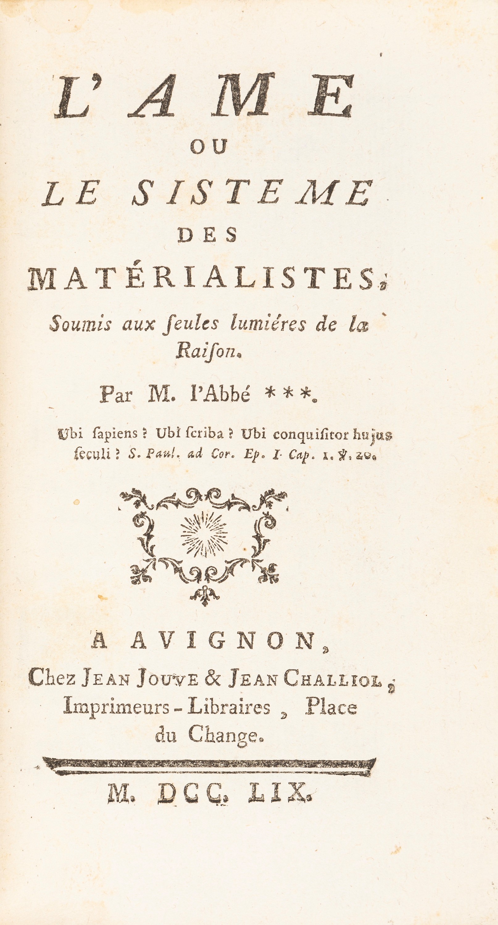 1759 Avignone, Jean Jouve Challion, 1759. In 12°. eleganti testatine, qualche alone, legatura coeva in marocchino rosso, piatti inquadrati da cornici floreali, decorazione impressa in oro, al centro del campo le armi di Paul, des Comtes de Passionei contenute in ovale, tagli dorati e marmorizzati, stemma del piatto anteriore con perdita di decorazione.