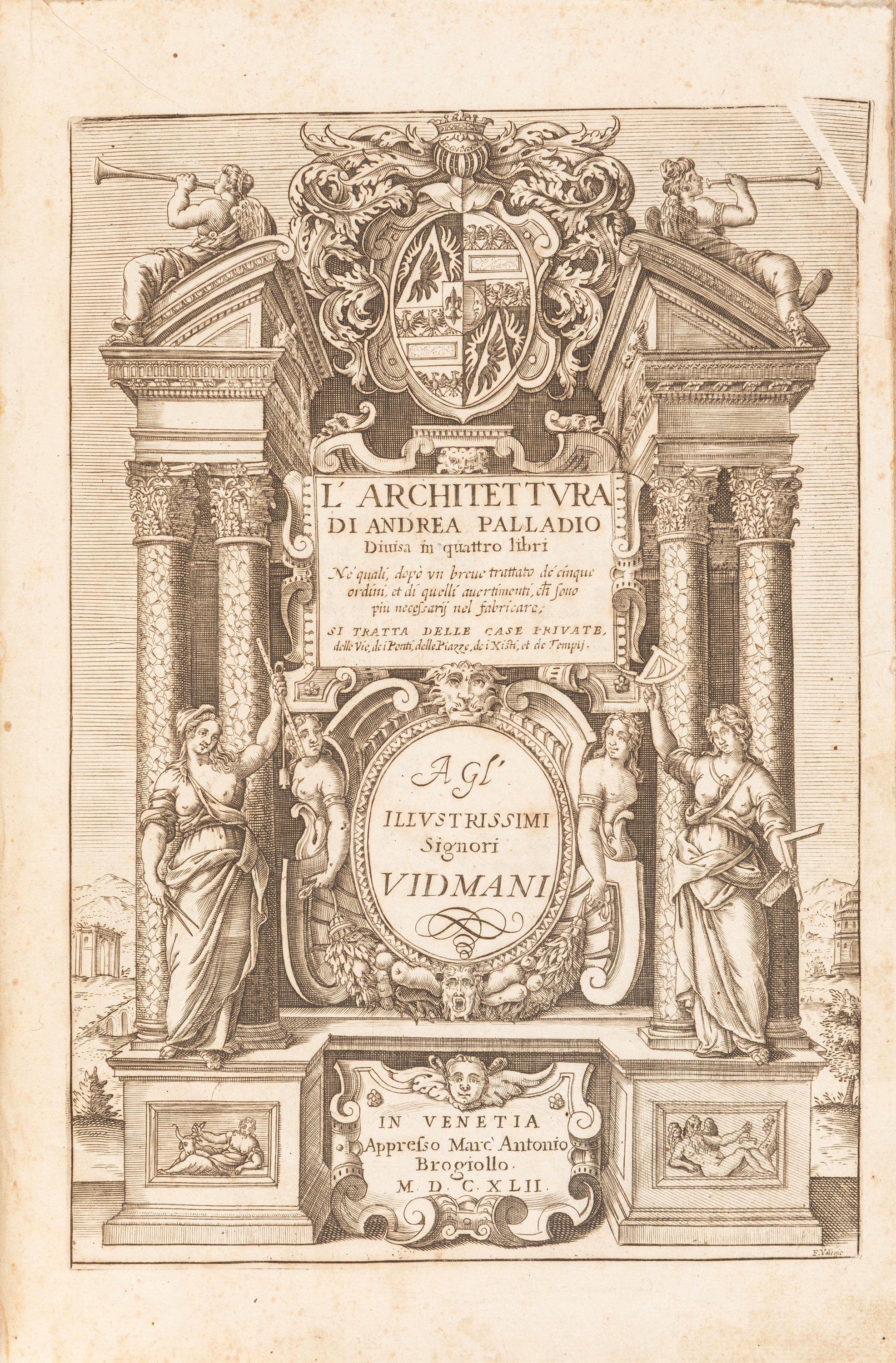 Venezia, Marco Antonio Brogiollo, 1642. In 2°. 4 parti in un volume, frontespizio inciso a piena pagina in elaborata cornice architettonica figurata con stemma Widman sul fastigio (inc. Francesco Valesio), edizione interamente illustrata con numerose illustrazioni xilografiche a piena pagina, decorazioni e 4iniziali xilografiche, errori nella numerazione delle pagine, bruniture e fioriture, ultima pagina con strappo senza perdita di testo, legatura coeva del sec. XIX, in vitello marrone, ai piatti cornice impressa in oro, al centro del campo la iscrizione Premio del disegno in oro, ed al piatto inferiore Desenzano 1814 AL dorso tassello in pelle rossa con autore e titolo, difetti. Nota di possesso al foglio di guardia di mano coeva.