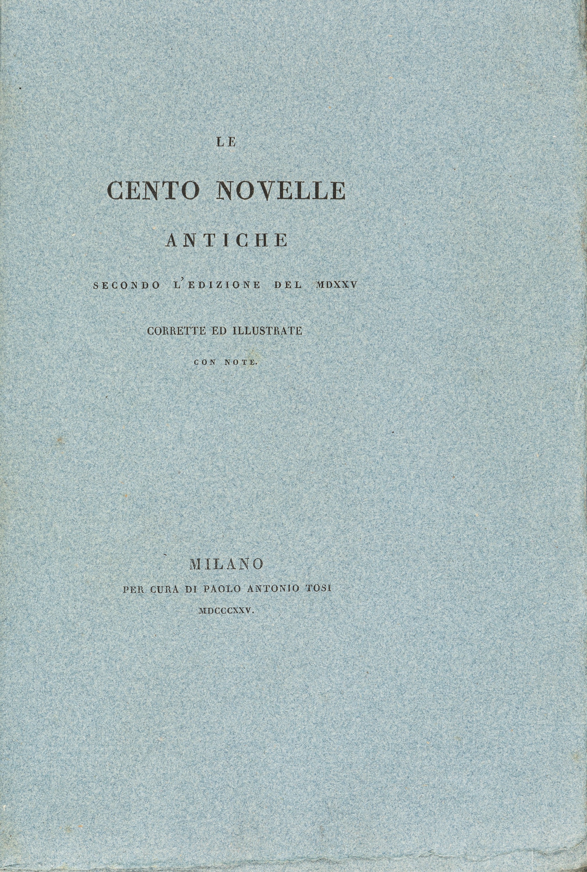 Milano, per cura di Paolo Antonio Tosi, 1825 (Impresso in Milano coi tipi di Felice Rusconi a spese di P.A. Tosi compiendo il terzo secolo dopo l'edizione del Benedetti). In 8°, 230 x 152 mm. Splendido esemplare su carta azzurra, intonso. Legatura coeva in cartone rigido, rosa. Duplicato (Moretti) della biblioteca Trivulziana.