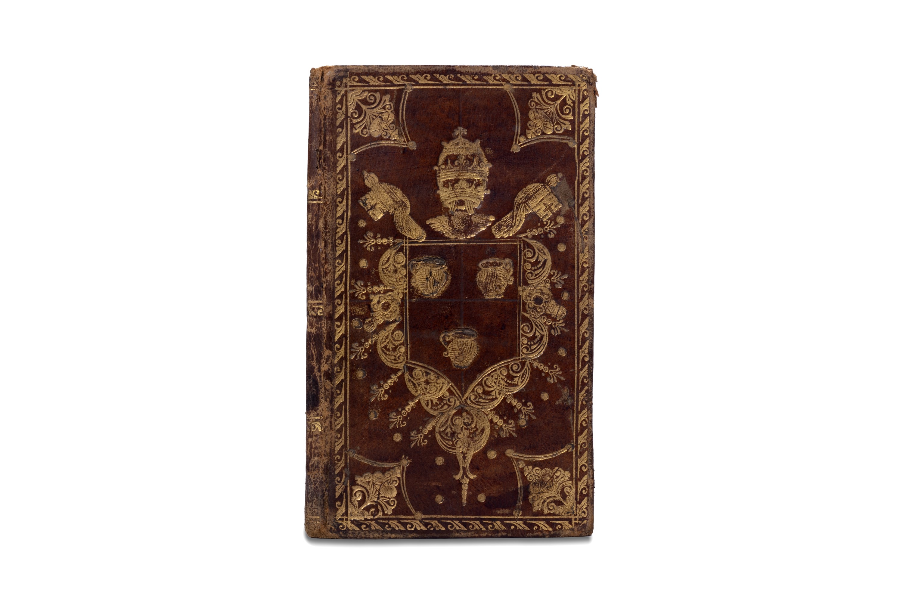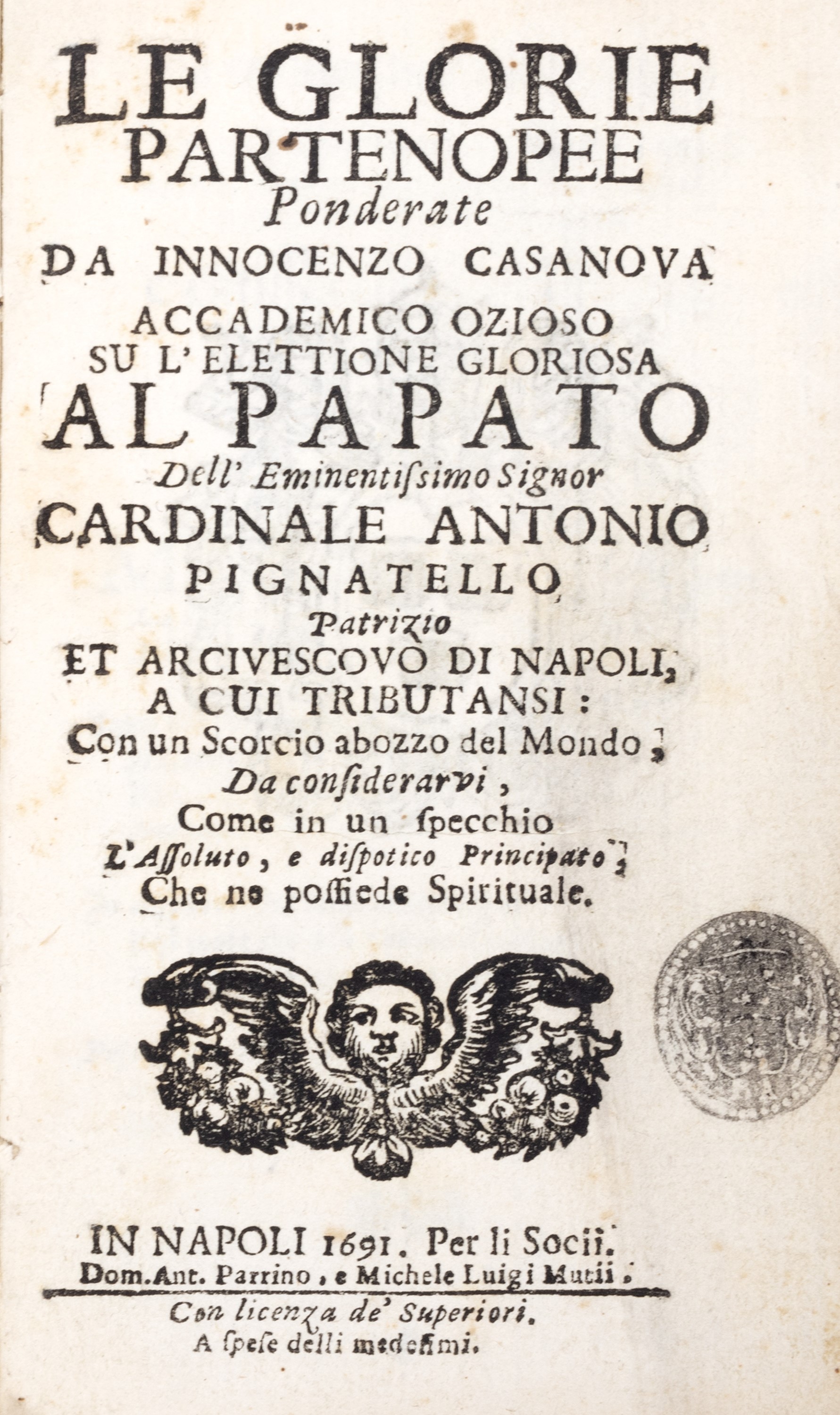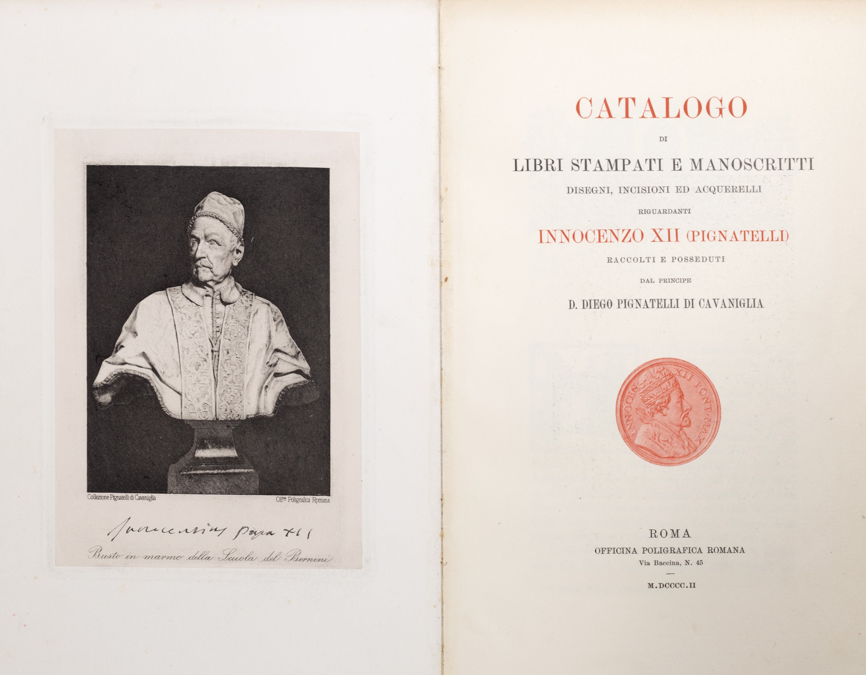 1805 Napoli, Parrino e Mutii, 1691. In 12°. Stemma di papa Innocenzo XII (già cardinale Antonio Pignatelli) a carta B1 e sul verso del frontespizio, rare lievi arrossature, corpo del libro parzialmente staccato dalla legatura, legatura coeva in pelle con al centro dei piatti riccamente decorati le armi papali della famiglia Pignatelli, lievi difetti. § Officium Hebdomadae Sanctae Justa Forma Missalis & Breviarii Romani sub Urbano VIII, Venezia, Tipografia Balleoniana, 1805. In 8°. Vignetta calcografica al frontespizio, testo in rosso e nero, lievi fioriture e arrossature sparse, carta di guardia staccata, legatura in pelle del sec. XVIII, ai piatti impressioni in oro, al centro la sigla T F, femaglio in metallo di epoca successiva, lievi difetti, fermaglio allentato al piatto posteriore. § Insieme nel lotto Pignatelli di Cavaniglia, D. Diego, Catalogo di Libri stampati e manoscritti disegni, incisioni ed acquerelli riguardanti Innocenzio XII (Pignatelli), Roma, Officina poligrafia Romana, 1902.