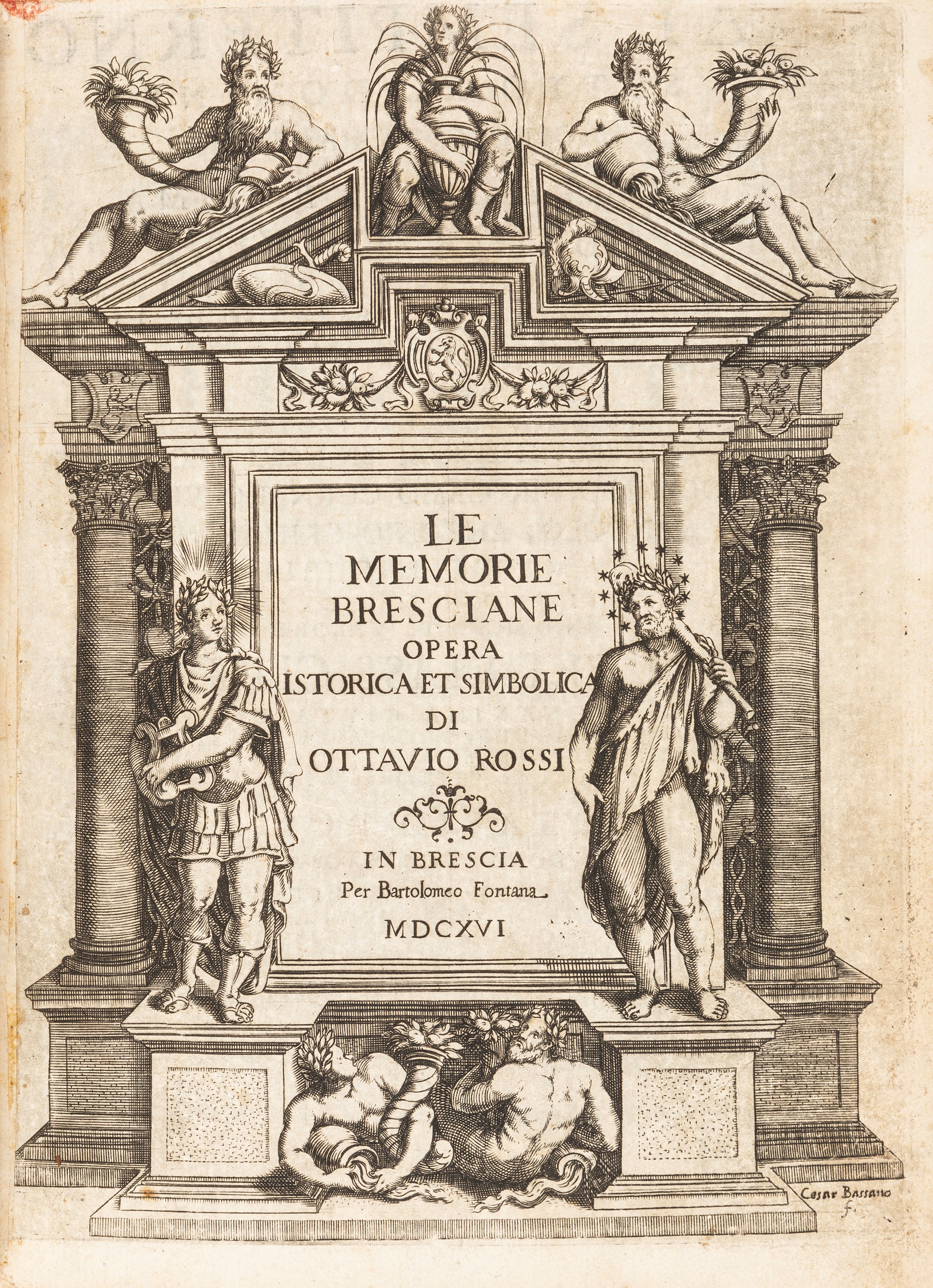 1616 Bartolomeo Fontana, 1616. In 4°. Frontespizio figurato inciso su rame da Cesare Bassano, incisione a doppia pagina raffigurante Brescia antica una tavola ripiegata e numerosi incisioni su rame e in xilografia a doppia e a piena pagina o nel testo, errori nella paginazione, qualche macchia e aloni, legatura del sec. XIX, in vitello marrone, tagli rossi, spellature e lievi difetti. Timbro di possesso al al foglio di guardia.