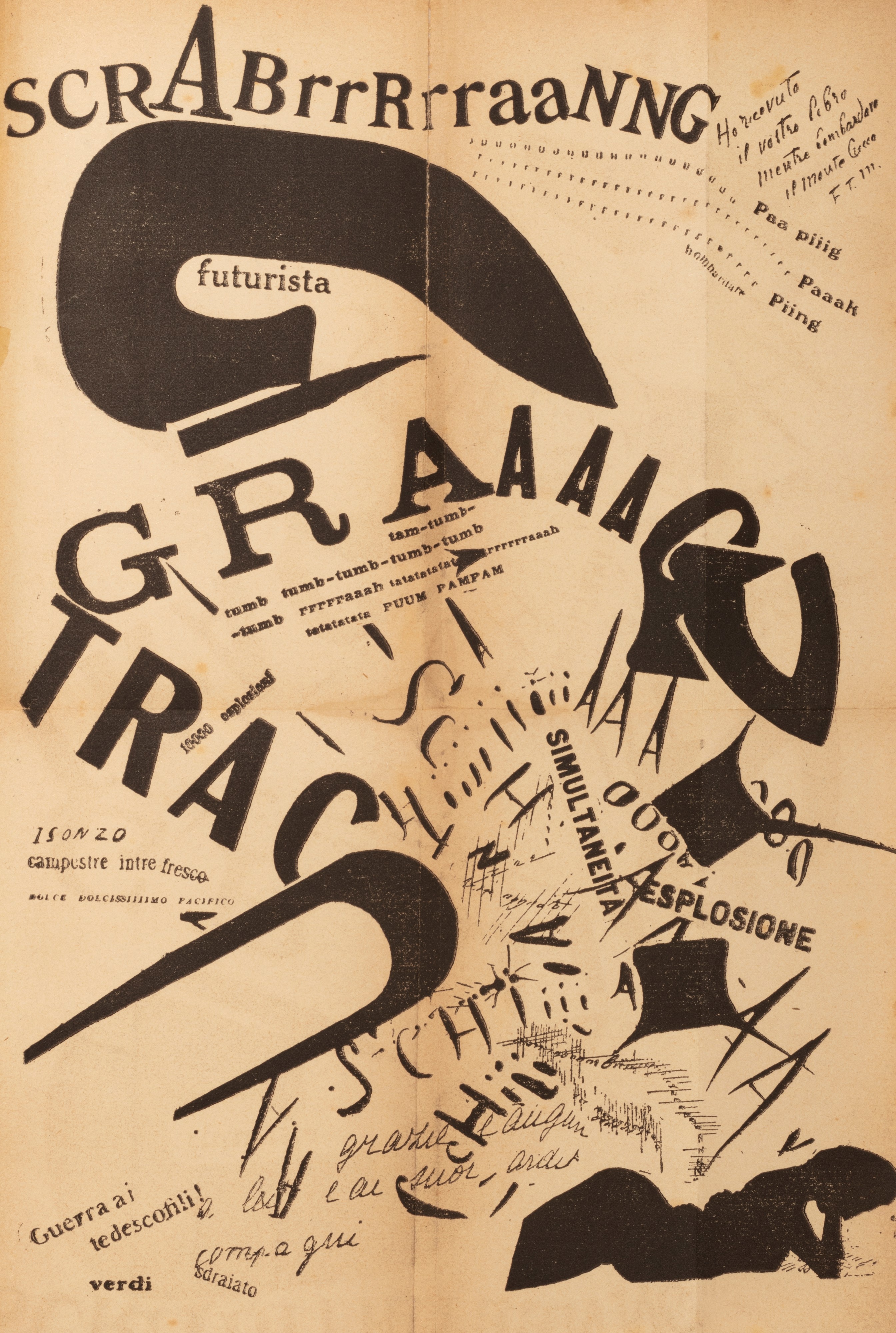 Milano, Edizioni Futuriste di Poesia, 1919. In 16°, pp. 110-(4) + 4 (Pubblicità) con 4 tavole Parolibere ripiegate f.t., legatura in mezzo marocchino bleu, cordoni, fregi in oro al dorso, conservata la copertina superiore Parolibera stampata a due colori. Conservato in astuccio di tela con titolo in oro al piatto. Lievi difetti.