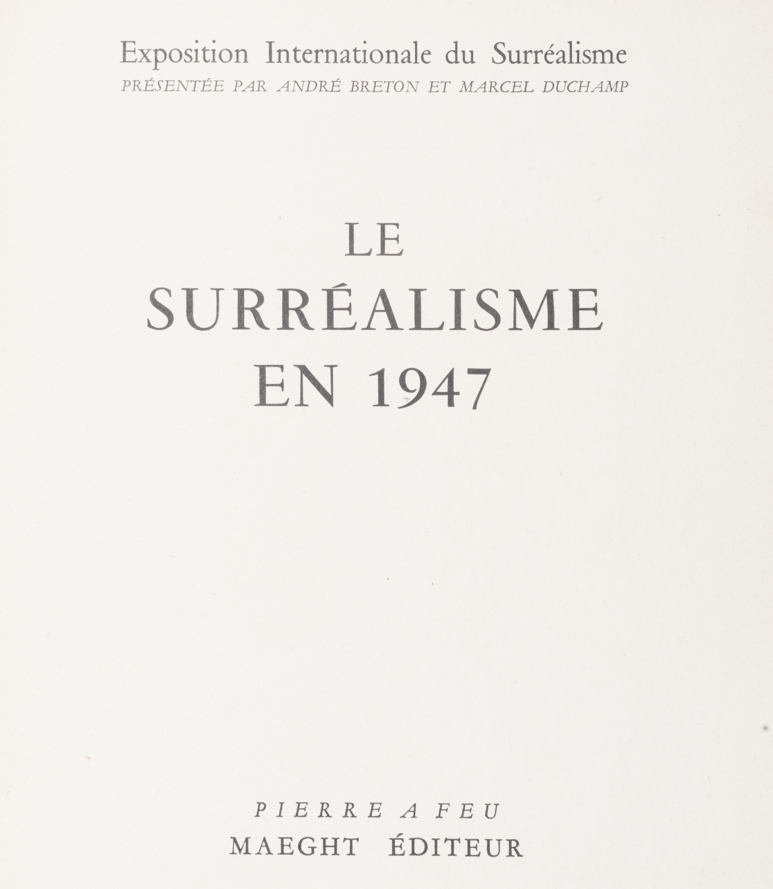 Paris, Edition Pierre à Feu – 5Maeght, 1947. In 8° quadrato, pp. 140 per il testo, con 20 illustrazioni e XLIV tavole e 24 fuori testo originali: 5 litografie a colori di Victor Brauner, Max Ernst, Jacques Hérold, Wilfredo Lam e Joan Mirò, 5 acqueforti, di cui una a colori, di Hans Bellmer, Marcel Jean, Maria, Yves Tanguy e Dorothée Tanning, 2 xilografie di Jean Arp e 12 litografie in nero di Serge Brignomi, Alexander Calder, Bruno Capacci, Elisabeth van Damme, Julio de Diego, Enrico Donati, David Hare, Jacqueline Lanba, Matta, Kay Sage, Yve Tanguy, Toyen. L'impressione delle acqueforti è opera di Lacourière, quello dei legni e delle litografie in nero e a colori sono opera dei fratelli Mourlot. Tutte le lastre, i legni e le pietre sono state distrutte dopo la stampa. Brossura edit.oriale con astuccio, illustrata da una riproduzione fotografica del manifesto originale di Marcel Duchamp. Lievi difetti.