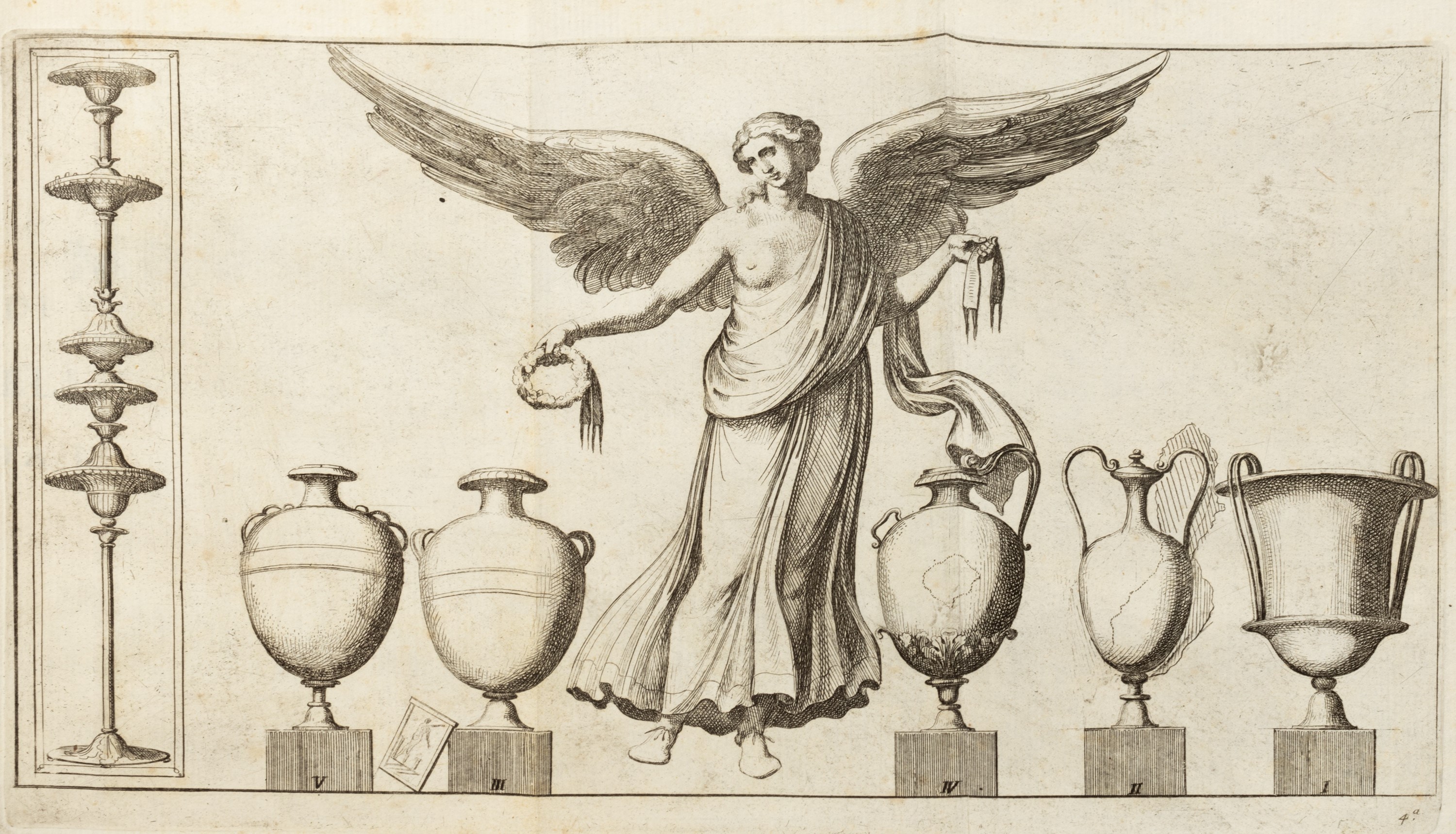Roma, Girolamo Mainardi, 1744. In 4 grande. 2 parti in 1 vol. La seconda parte con titolo: Le singolarità di Roma moderna, ricercate e spiegate. Primo libro con antiporta figurata incisa su rame, vignetta incisa su rame al frontespizio in rosso e nero, 39 tavole incise su rame a piena pagina fuori testo, di cui 3 ripiegate, 1 carta con strappo senza perdita lungo la piegatura; II libro con 2 tavole di cui 1 ripiegata, numerose altre illustrazioni nel testo, qualche leggera gora d'acqua, lievi arrossature e fioriture, poche carte con leggera brunitura, legatura coeva in pergamena, titolo in oro, tagli rossi, dorso rifatto, qualche alone ai piatti, lievi difetti. Ex libris cartaceo al contropiatto.