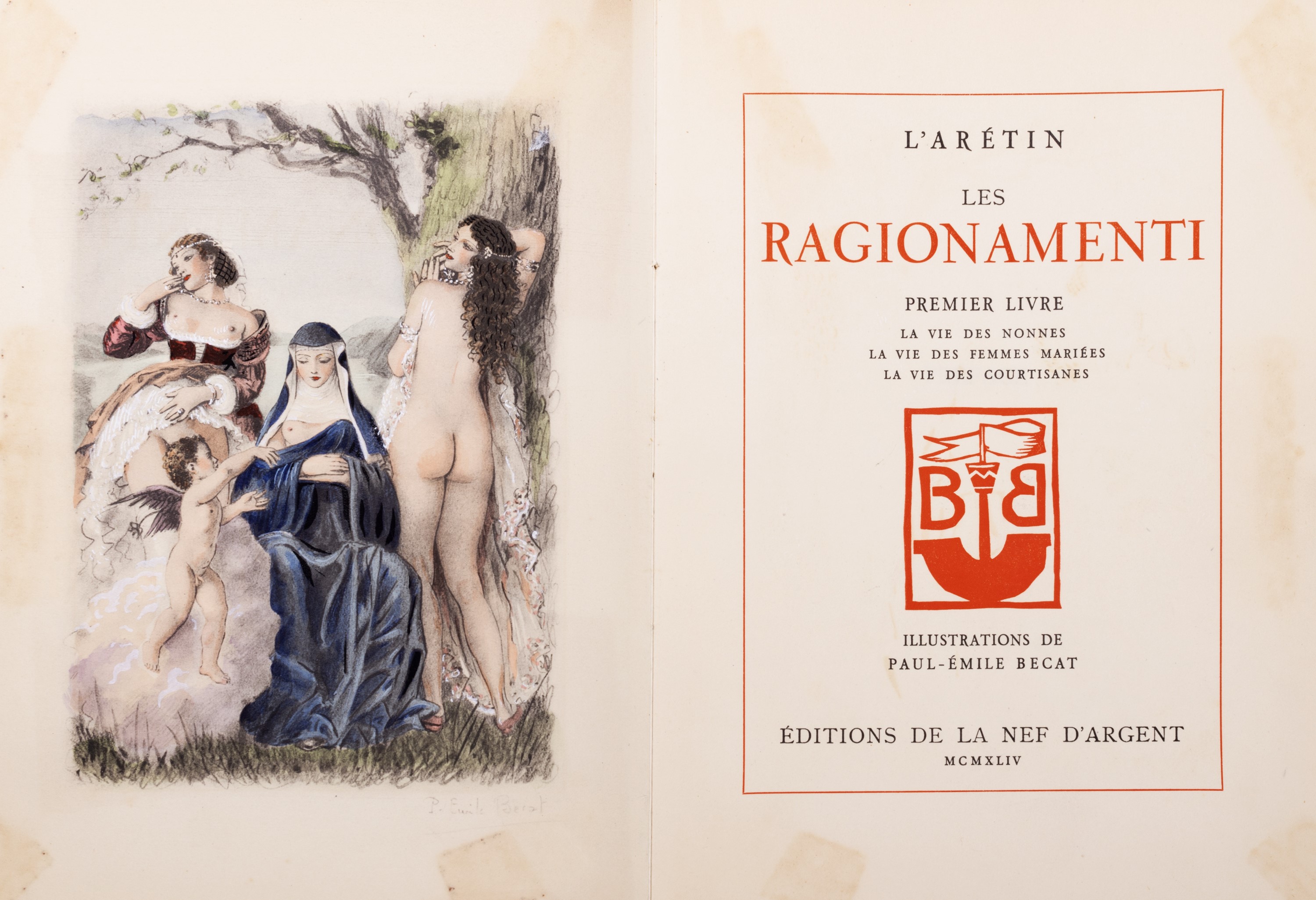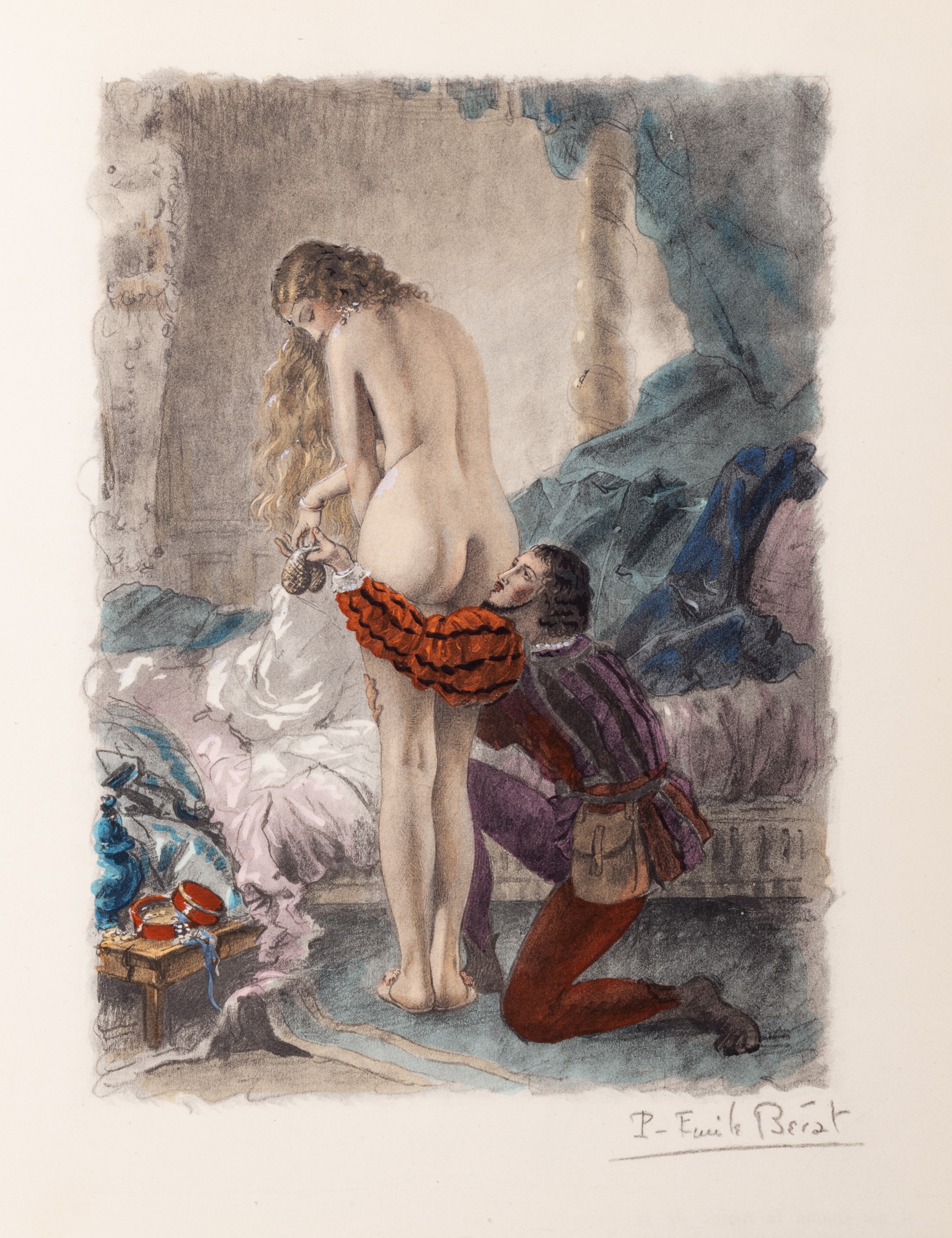 Parigi, Edition de la nef d'argent, 1944. In 8°. voll. 2, pp. 145-(3); 211-(3) con 6 vignette xilografiche, poste come testatine ai capitoli, e 32 tavole xilografiche, f.t., di soggetto erotico, firmate su lastra da Paul Becat e colorate da “le maitre enlumineur Benson” sotto la direzione dell’artista. Capilettere figurati e finalini. Brossura editoriale illustrata da due xilografie. Lievi difetti.